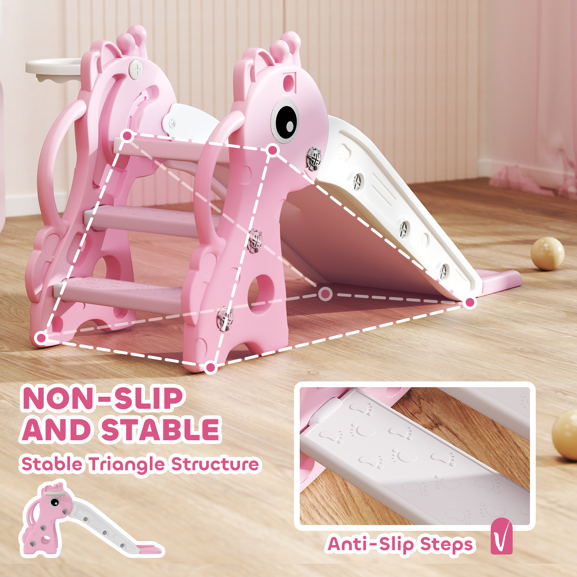 Transform your home into a playful paradise with the AIYAPLAY kids slide! This delightful 3-step toddler slide, shaped like a charming giraffe, features a slide, basketball hoop and ball. Designed with non-slip pedals and secure handrails, it assures a safe and joyful playtime. This slide's adorable pattern design and bright colours add a friendly look to your child's play area. Suitable for indoor fun, it supports toddlers aged 1-3 years up to 30 kg.