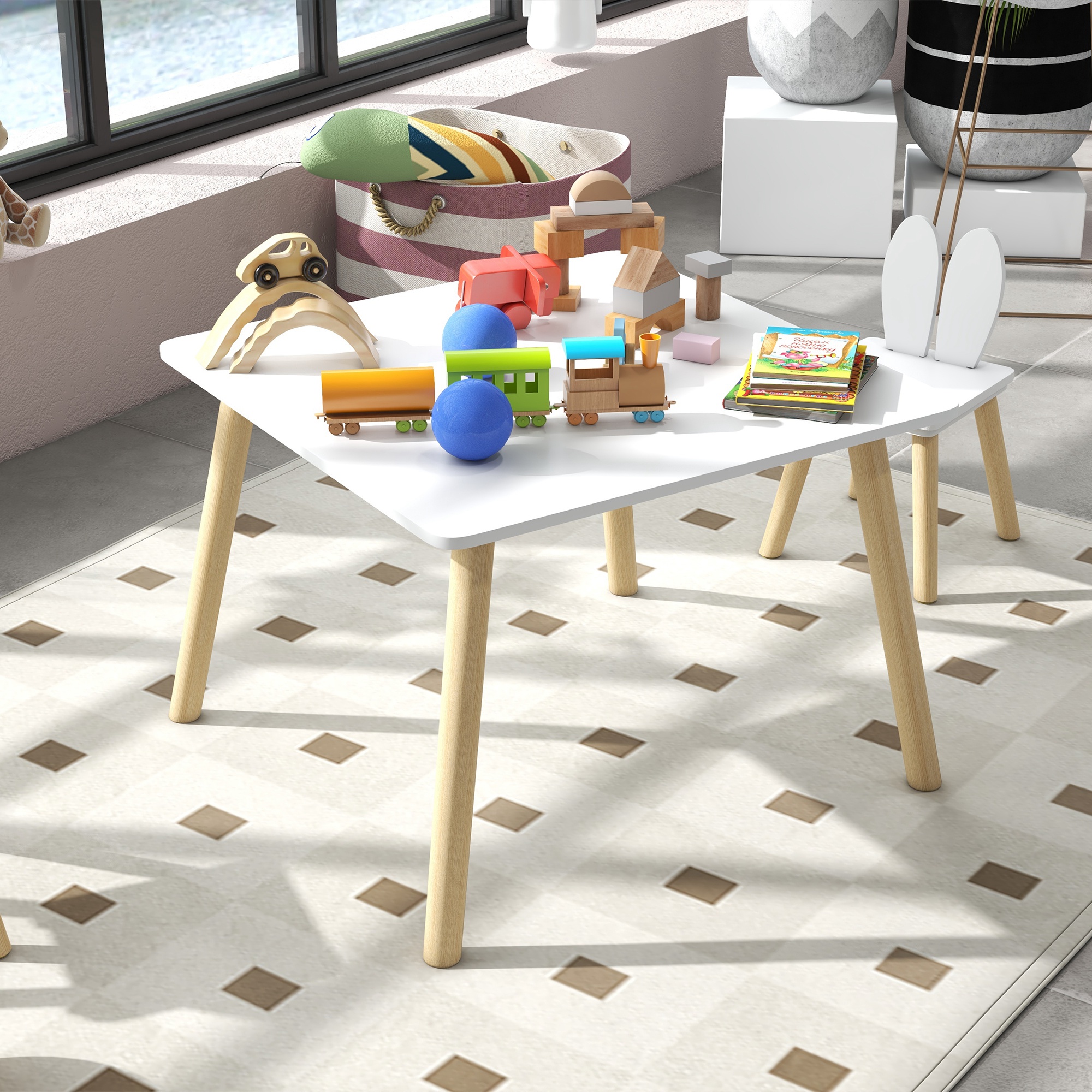 Discover the charm of the AIYAPLAY Toddler Table and Chair Set, featuring adorable bunny ear-shaped backrests. This delightful three-piece set includes a table and two chairs that are neatly tucked under the table to save space. Crafted from MDF with pine wood legs, it's suitable for any toddler's play area, classroom, or nursery. A playful yet practical choice for your little child's space!