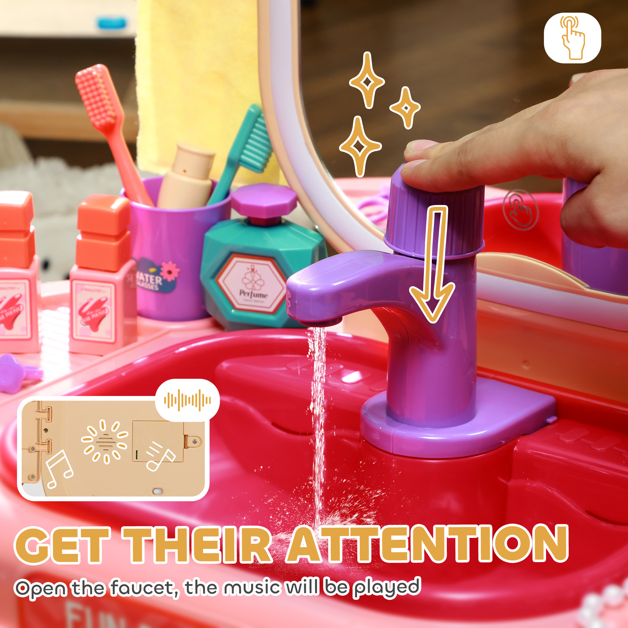 Bring something different to playtime with the AIYAPLAY kids vanity table. Featuring a mirror with magical LED lights and a faucet that plays music and really releases water, this makeup vanity set is great for creative, make-believe games. It also includes a special spot for the towel and hand sanitiser container, promoting good hygiene during play. This compact piece fits perfectly in a corner – let the fun begin!