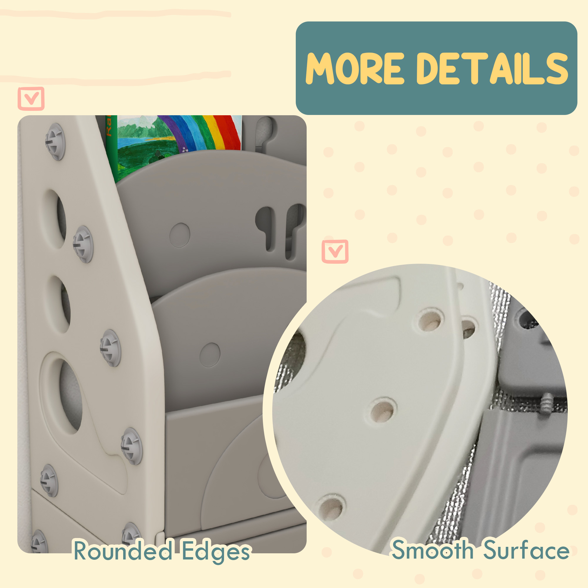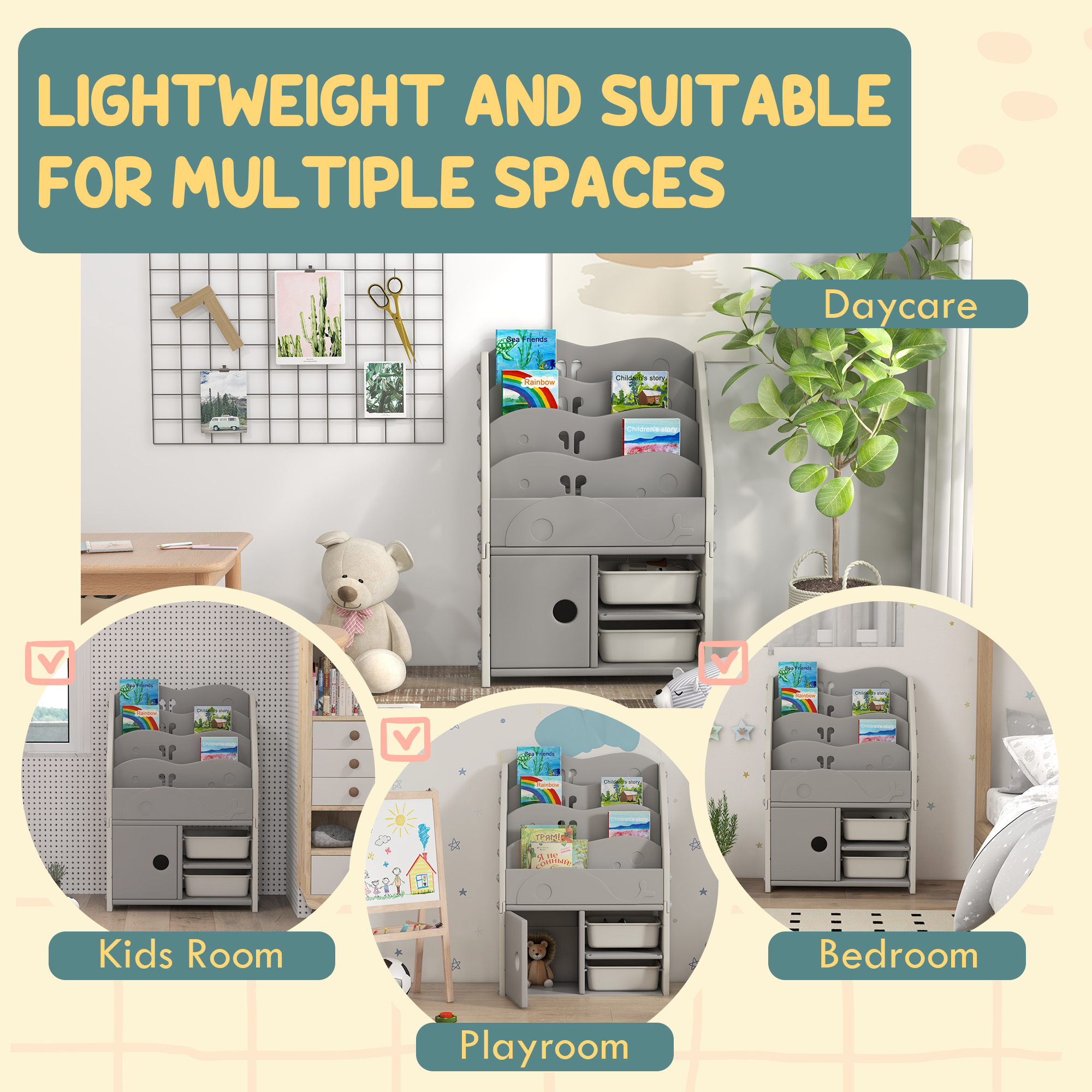 Discover the joy of tidiness with the AIYAPLAY kids storage units! This playful set features a 4-tier bookshelf, a cabinet and 2 storage boxes, offering lots of space for books, toys and treasures. Designed for 3-6 year-olds, it helps boost their organising skills, all while keeping their room clutter-free. Crafted from safe HDPE, it's a delightful addition to any playroom.