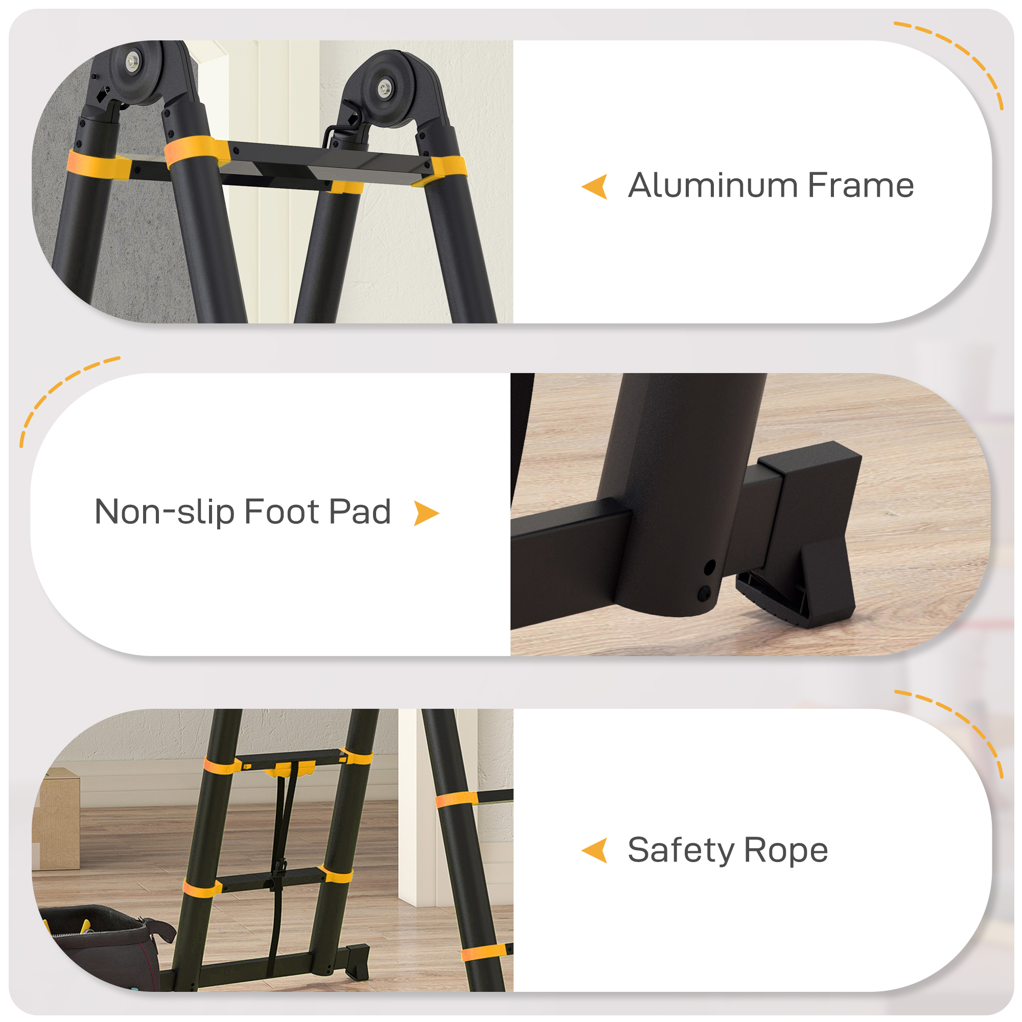 DURHAND multifunctional extension ladder will meet your needs. Fully unfold the ladder to climb the roof and trees, fix the shape of a man, paint indoors and replace the light bulb, to help you complete all tasks easily. When not in use, the collapsible ladder can also be folded up, only occupying a small space. Of course, the ladder is solid, which conforms to EN131 safety standard, so you can rest assured.