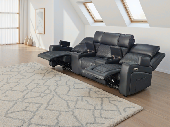 Upholstered in leather aire with stylish diamond-quilted stitching, this sofa offers superior comfort and functionality. The two end seats feature a smooth electric reclining function, allowing you to kick back at the touch of a button. The central console is perfect for movie nights, equipped with convenient cup holders and storage.