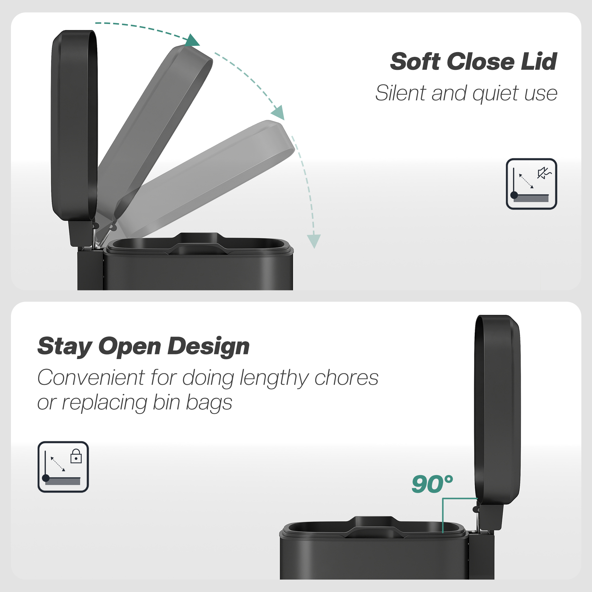 • Silent soft-close and stay-open lid, foot pedal for easy opening