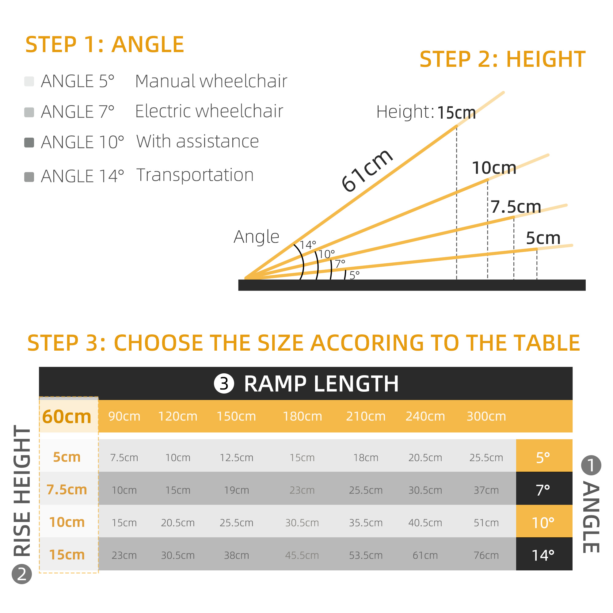 - Maximum weight 270kg, assembly required. You can follow the steps to buy this wheelchair ramp. Step 1. Measure the rise of your application. Step 2. Pick the proper ramp length based on your height of use