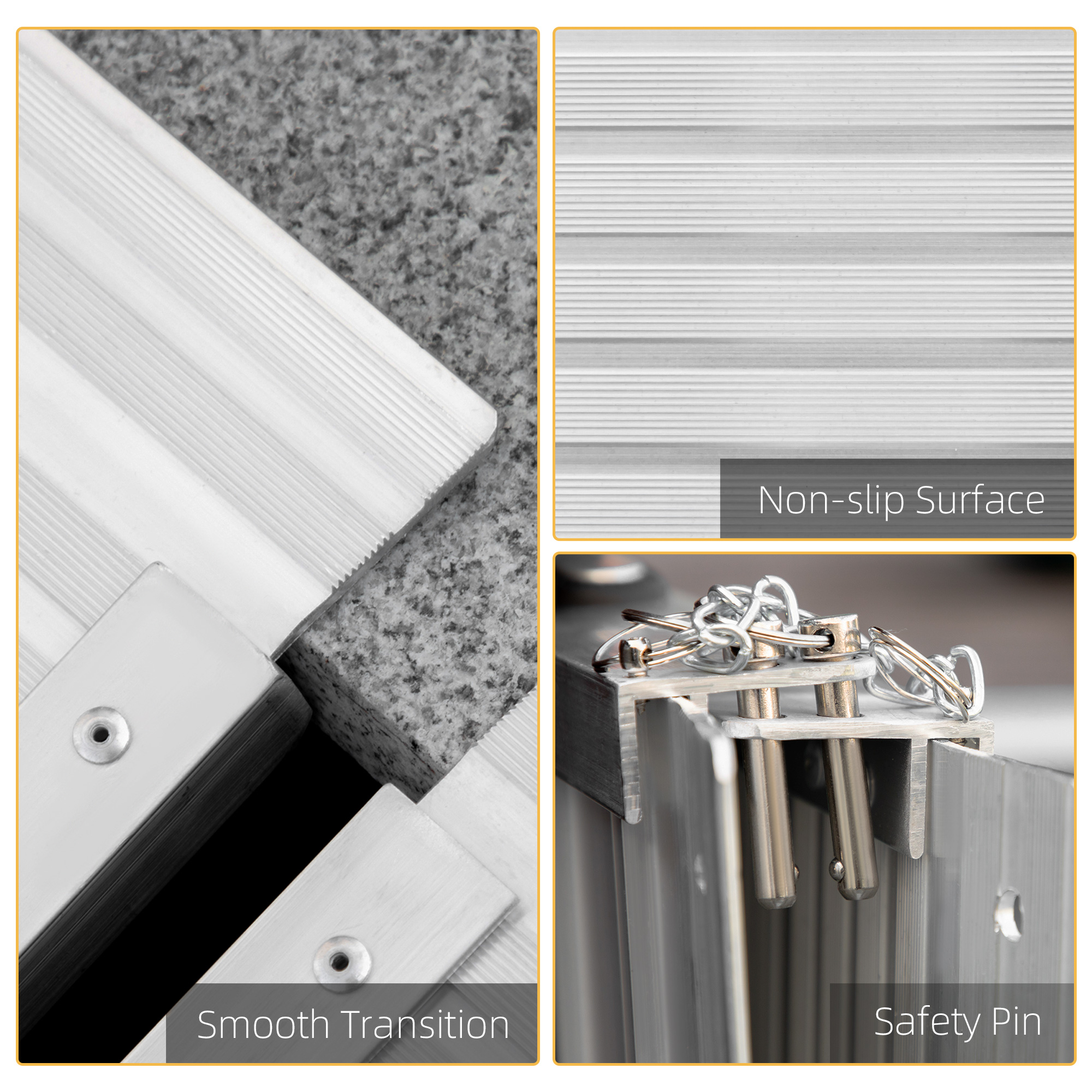 Get easier access to raised surfaces with this wheelchair ramp from HOMCOM. Covered with skidproof surface to prevent slipping, making it ideal for any weather condition. When not in use, the mobility scooter ramps can be easily folded, saving space and enabling storage in the vehicle or at home. The durable aluminium frame is anti-corrosive to last for years of usage. This door ramp can be used with wheelchairs, lawn mowers, scooters or any other heavy item that may have trouble with stairs.