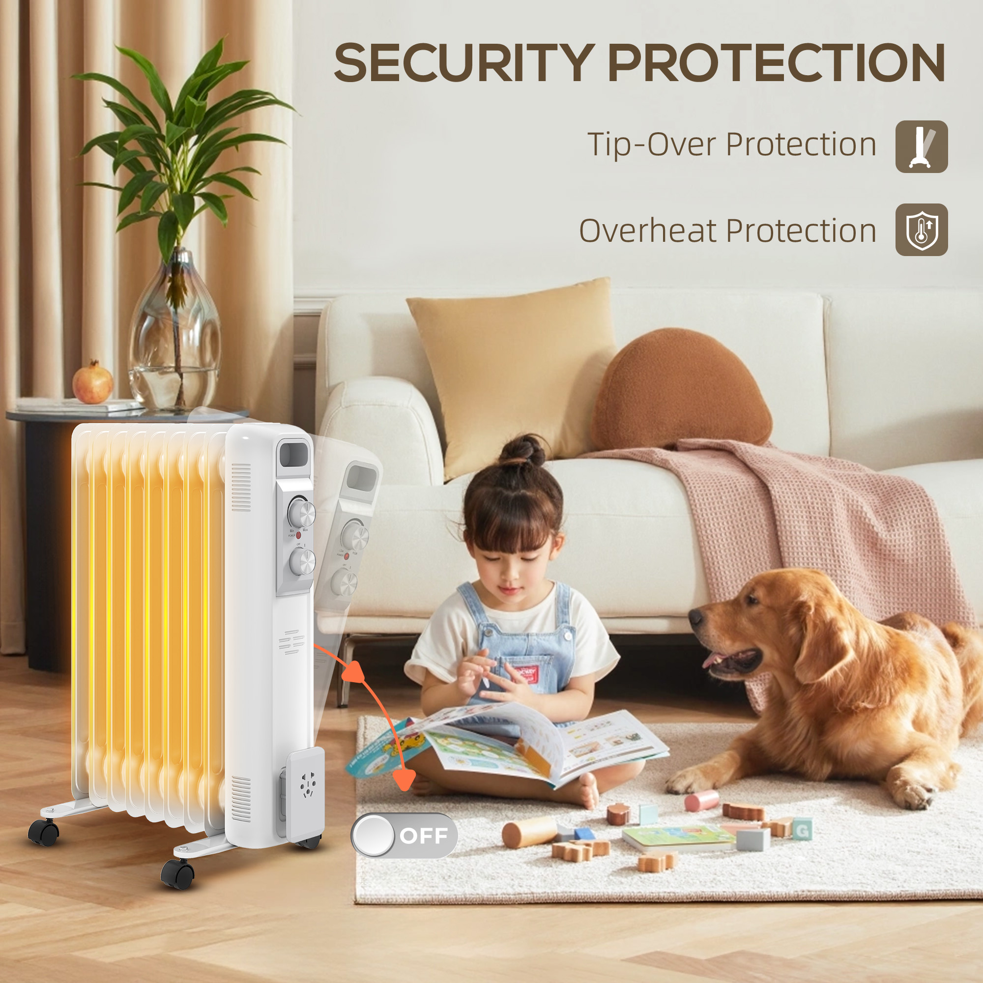 - Auto-shut off: radiator turns off if it overheats or tips over