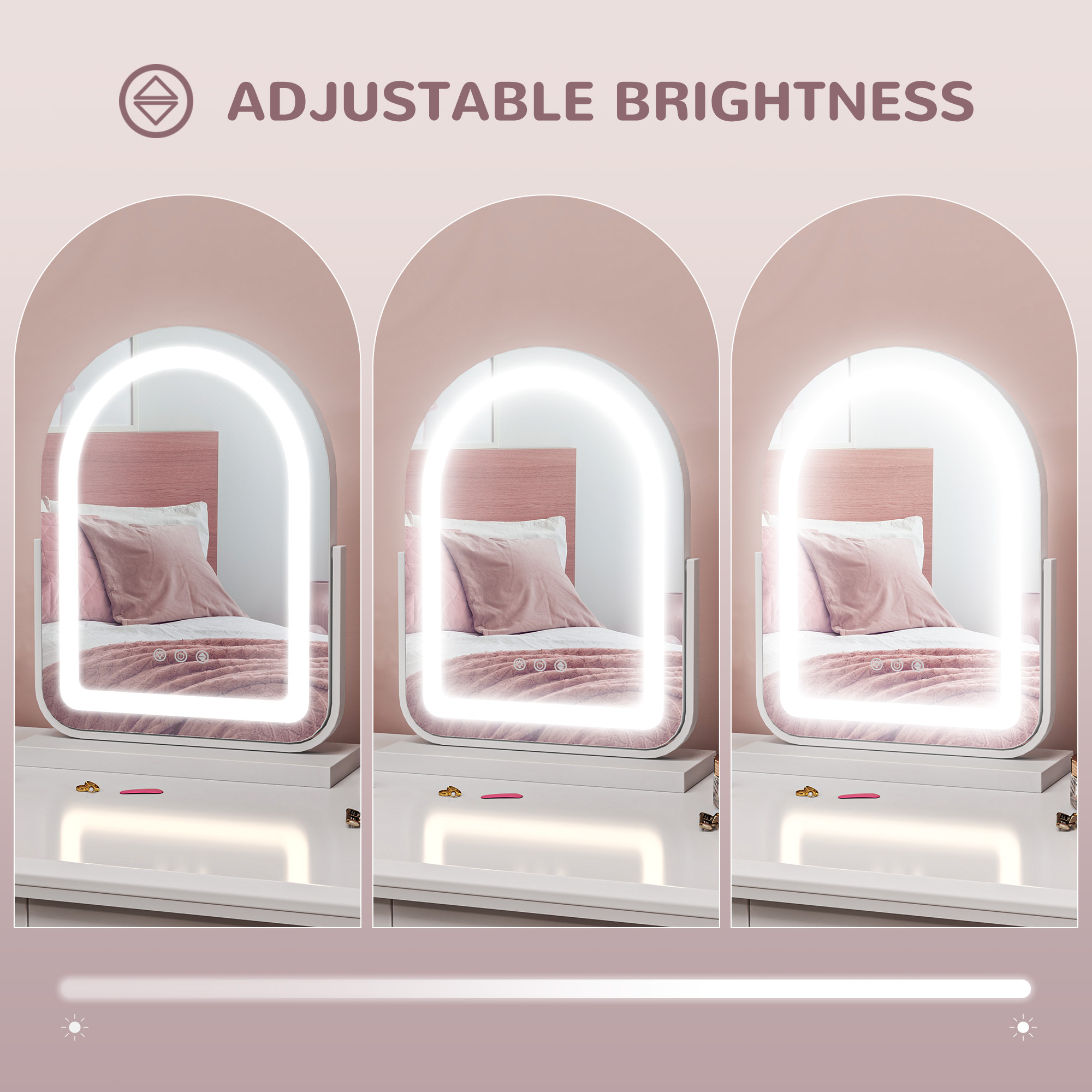 Easy reflection day and night comes with this HOMCOM makeup mirror. The removable LED light strip on the outer has three colours - warm, cool and natural: with the adjustable brightness it's easy to change and set the mood. Finished with the 360° rotating base to move freely to the position you want.