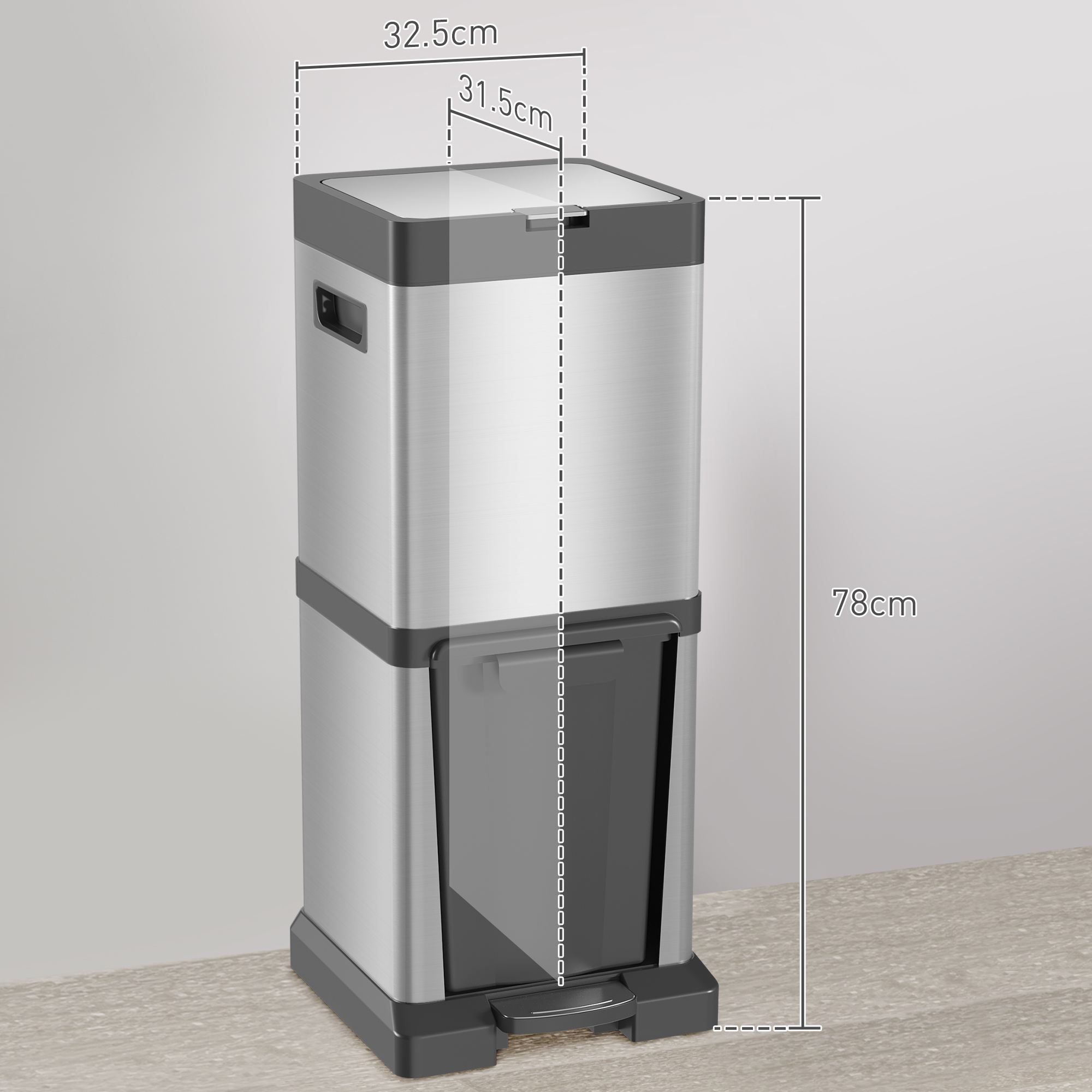 Enhance your eco-friendly lifestyle with HOMCOM's double kitchen bin, designed for the conscientious consumer. This sleek, stainless steel bin features a 20L top compartment and a 14L tilting bottom bin, making waste separation easy and efficient. The fingerprint-resistant finish ensures it remains pristine, while the deodoriser holder keeps your kitchen fresh. Ideal for those committed to reducing household waste, this bin simplifies recycling and promotes a cleaner, greener home environment.