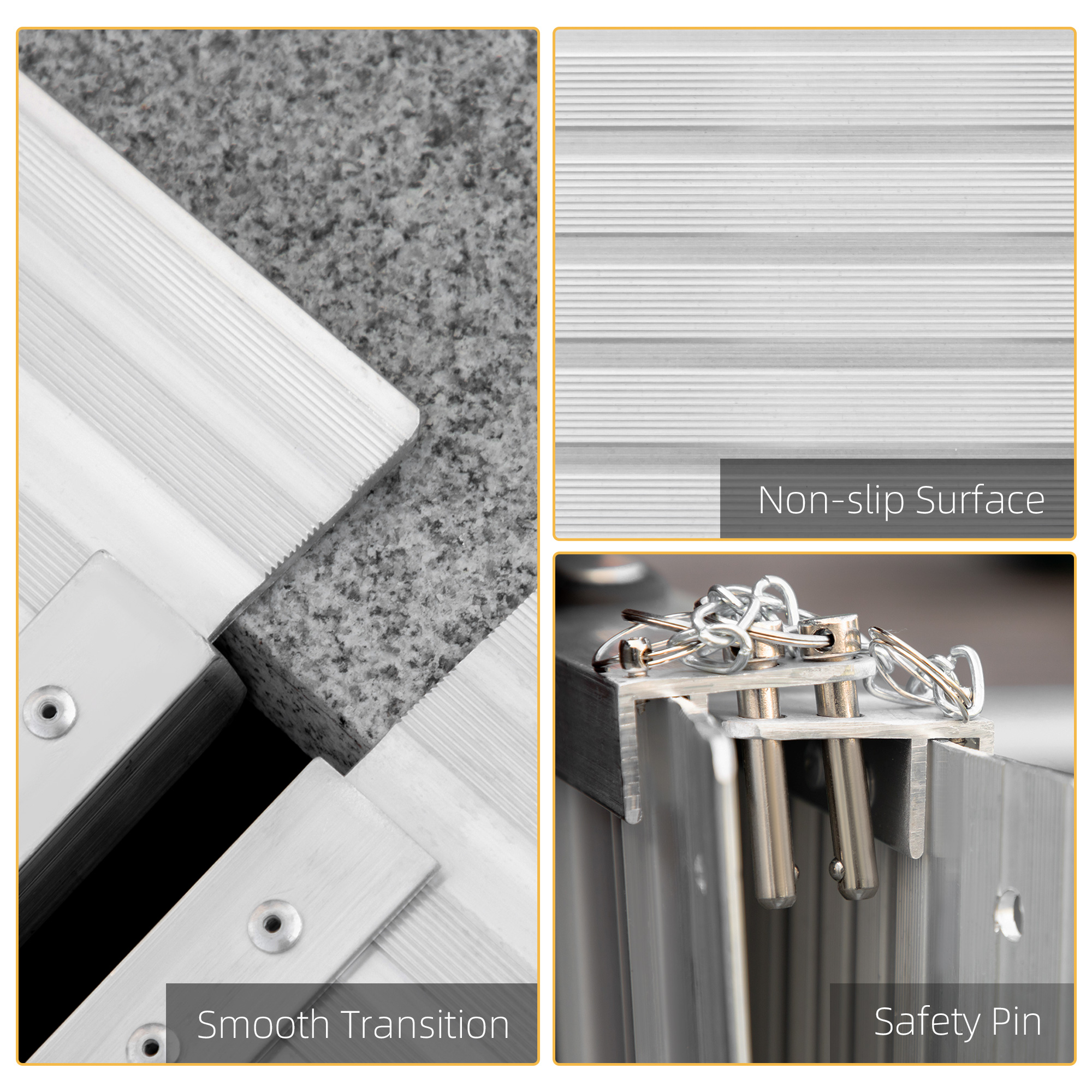 Get easier access to raised surfaces with this wheelchair ramp from HOMCOM. Covered with skidproof surface to prevent slipping, making it ideal for any weather condition. When not in use, the mobility scooter ramps can be easily folded, saving space and enabling storage in the vehicle or at home. The durable aluminium frame is anti-corrosive to last for years of usage. This door ramp can be used with wheelchairs, lawn mowers, scooters or any other heavy item that may have trouble with stairs.