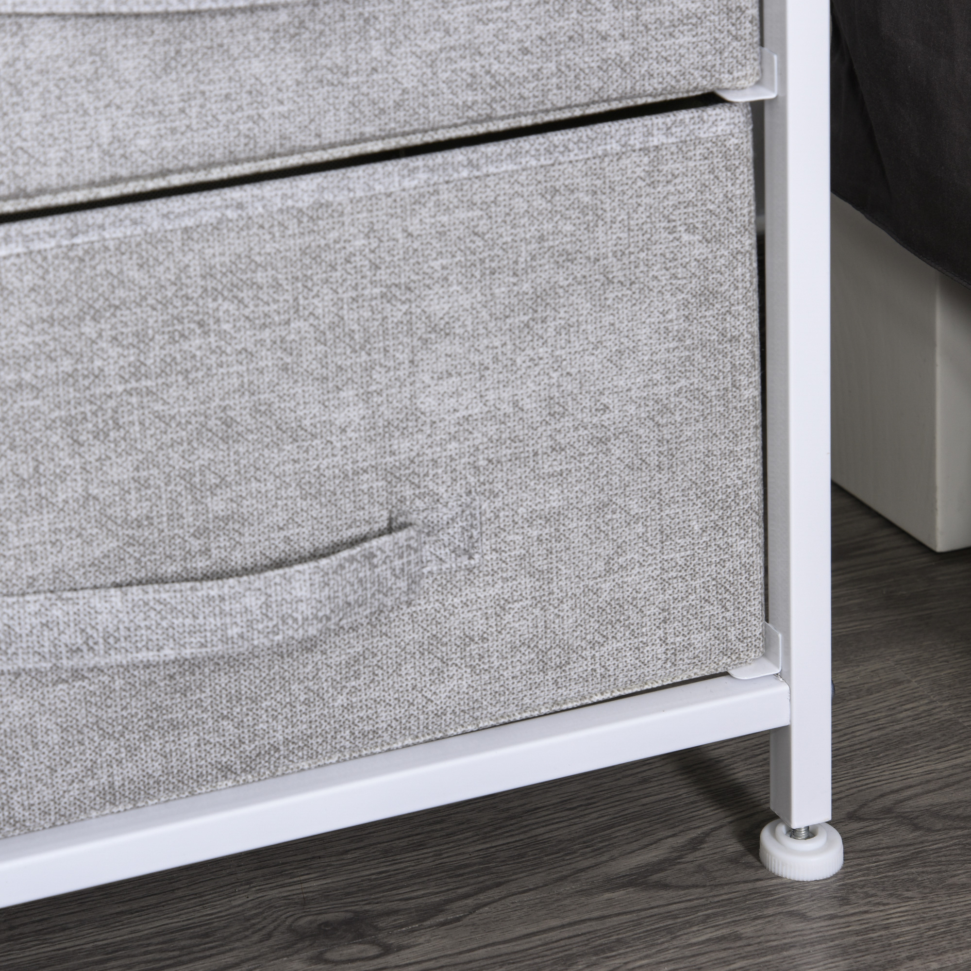 Bring easy and effortless storage into the home and beyond with this fabric drawer chest from HOMCOM. It features 2 small and three large drawers, giving you lots of room, with the flat surface top providing additional space. Made from linen, the drawers give a softened look to the appearance and feature handles to pull out easily. Connected to the metal frame with adjustable feet ensure this side cupboard keeps balanced, and it's finished with handles on the top so you can move it easily.