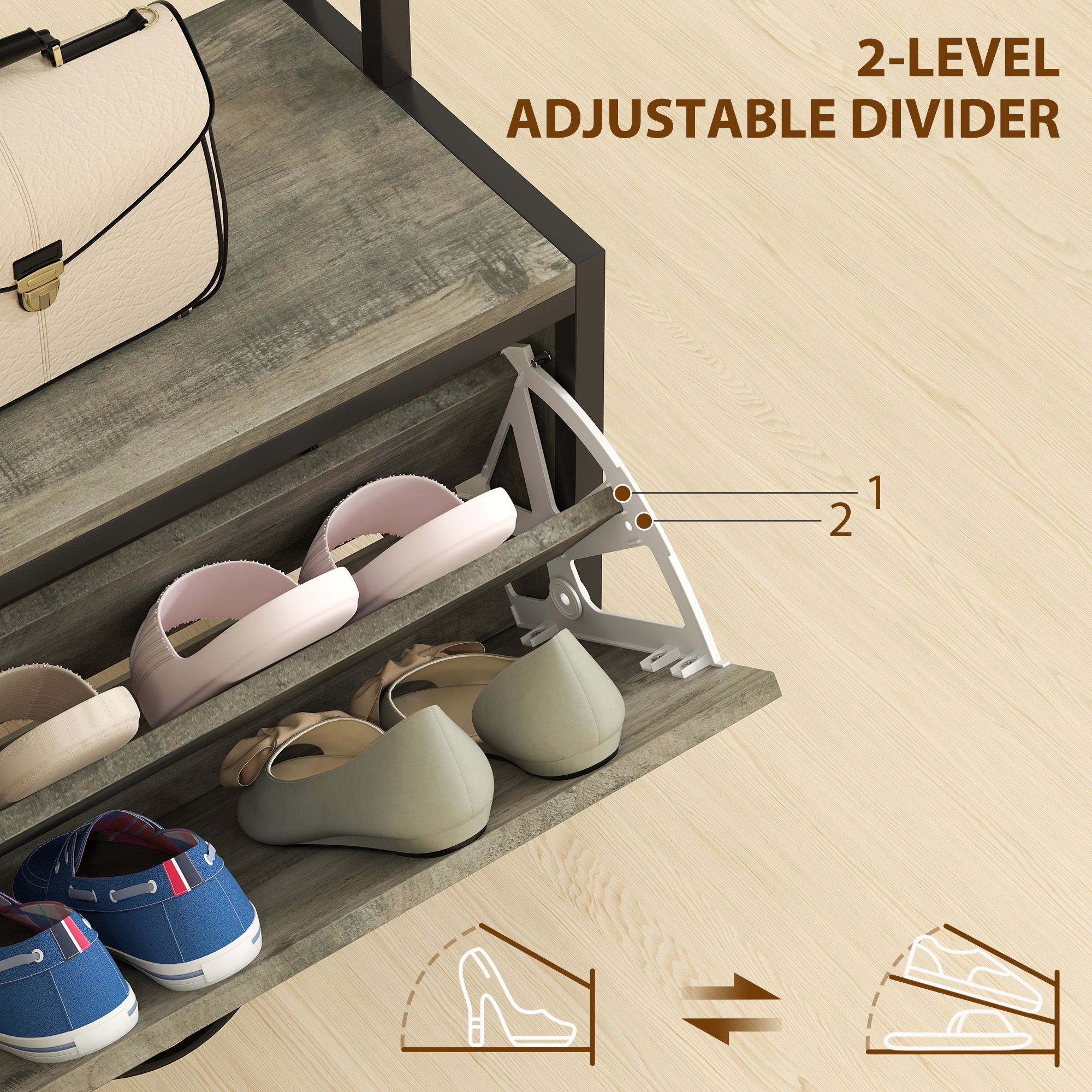An all-in-one spot for coats, shoes, accessories - and so much more, with this HOMCOM hall tree. It combines a top shelf, 5x fixed double hooks, 5x movable 'S' hooks, bench seat and two-tier shoe cupboard: plenty of space for individual and shared use. The coat rack with shoe storage is made from steel frame for a strong core, so it supports everything in place. Complete with adjustable feet for balance.