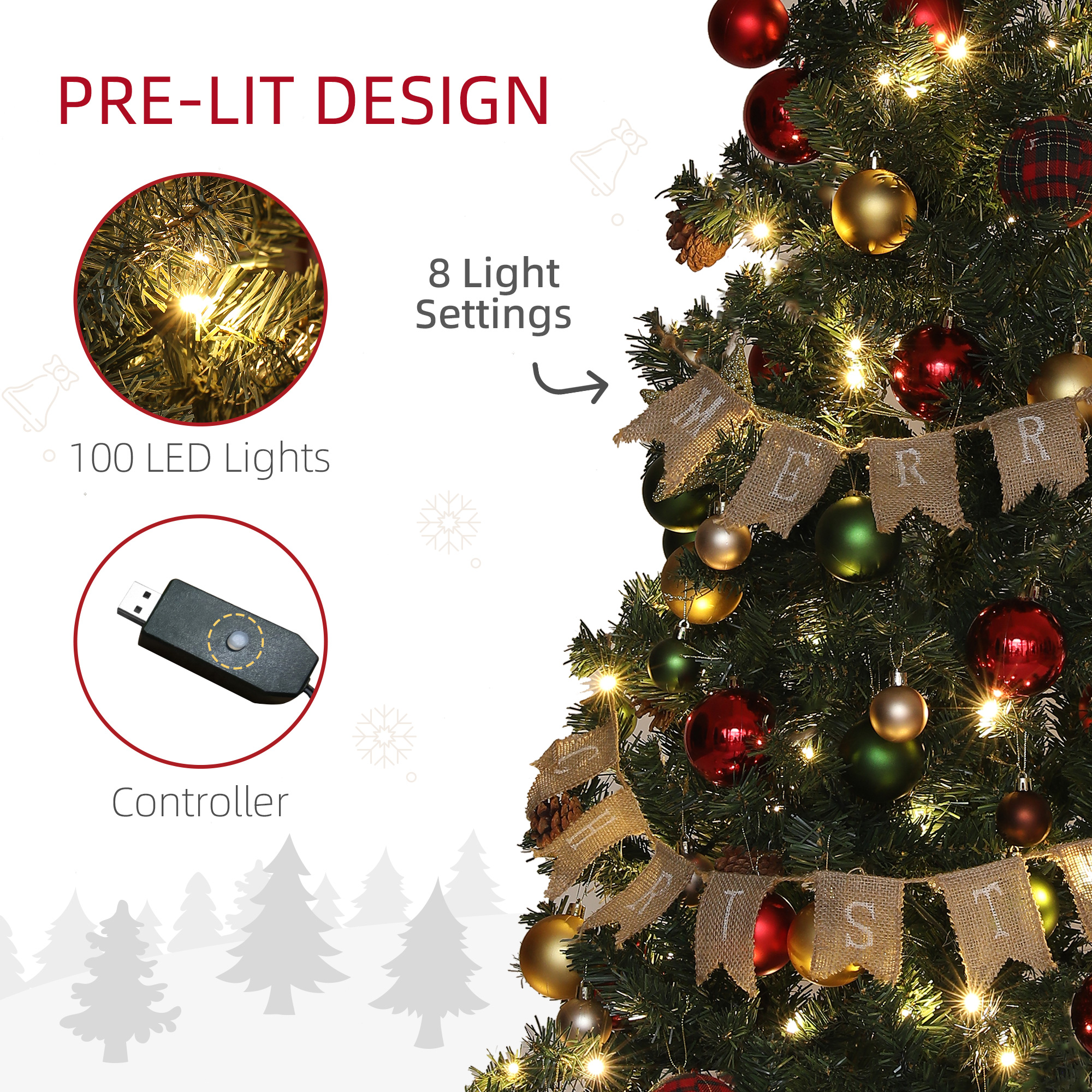 Go the extra mile this festive season with this HOMCOM pre-lit christmas tree. Made from flame-retardant plastic, this fake christmas tree is safe for use in your home. The warm white LED lights flick between eight modes, so you can choose the vibe of the illumination to suit you. Equipped with a 'MERRY CHRISTMAS' ribbon, top star, pine cones and decorative balls, this LED Christmas tree adds a sparkle to your celebrations. Complete with a steel base to stand steady.