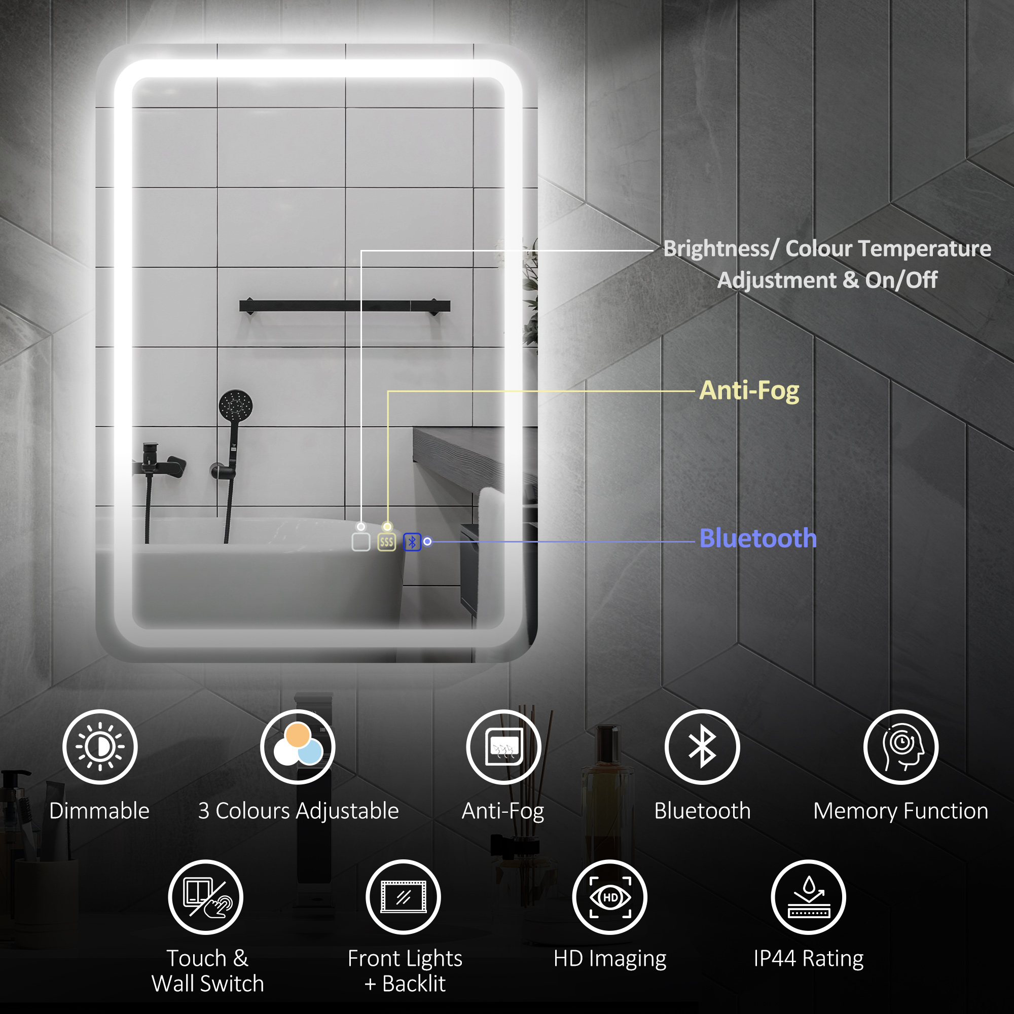 - IP44 rating makes mirror safe in steamy shower bathrooms