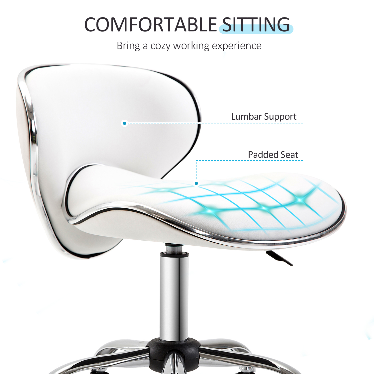 This HOMCOM workshop stool puts you at just the right height, helping to create great working circumstance. The firm back keeps your spine in proper form and the padded seat cushion gives you the comfort for the longer durations. With fives wheels, this hairdressing chair is easy to scoot around or slide around the working area. The polished chrome base and sleek design is suitable for most décor.