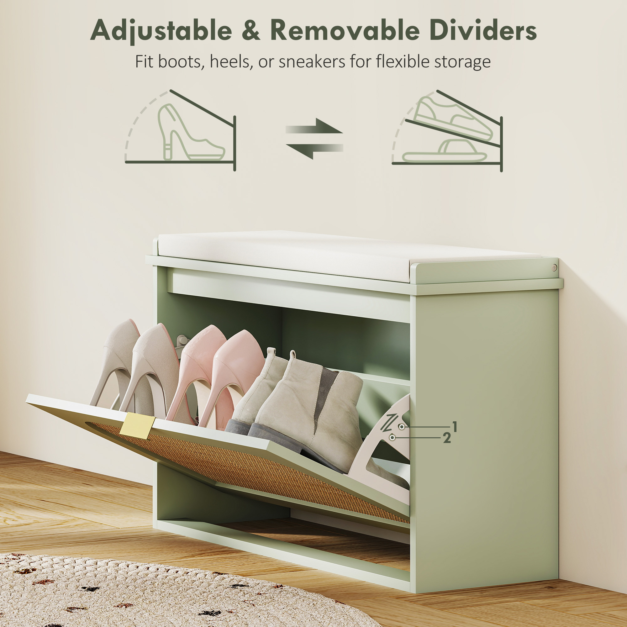 - A flip drawer holds up to eight pairs of shoes neatly