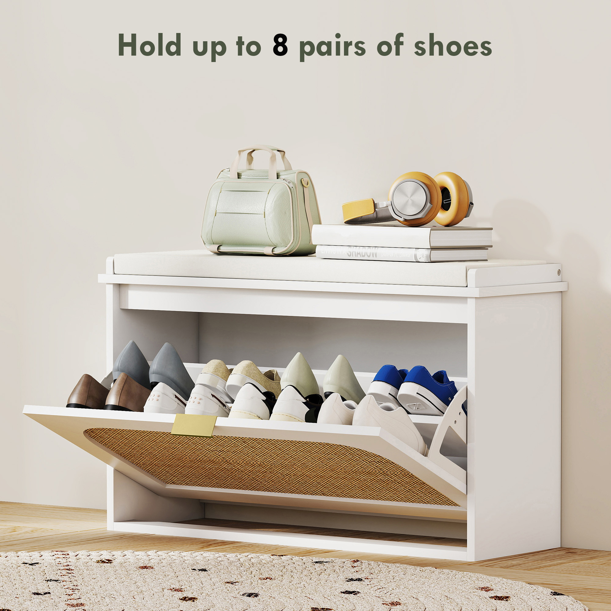 Step into a serene entryway with the HOMCOM shoe storage bench. Tired of clutter? The flip door and double shelf design offer effortless organization, keeping your shoes neatly arranged. Imagine the comfort of a thick cushion as you change shoes, with a breathable linen-feel fabric surface ensuring cleanliness. The rattan door adds a boho touch, enhancing your home's inviting atmosphere.