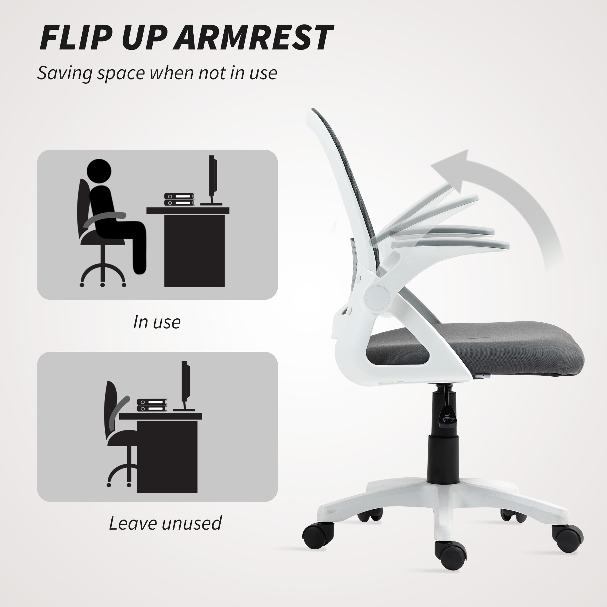- Flip-up armrests provide flexibility, allowing them to tuck under the desk when not in use