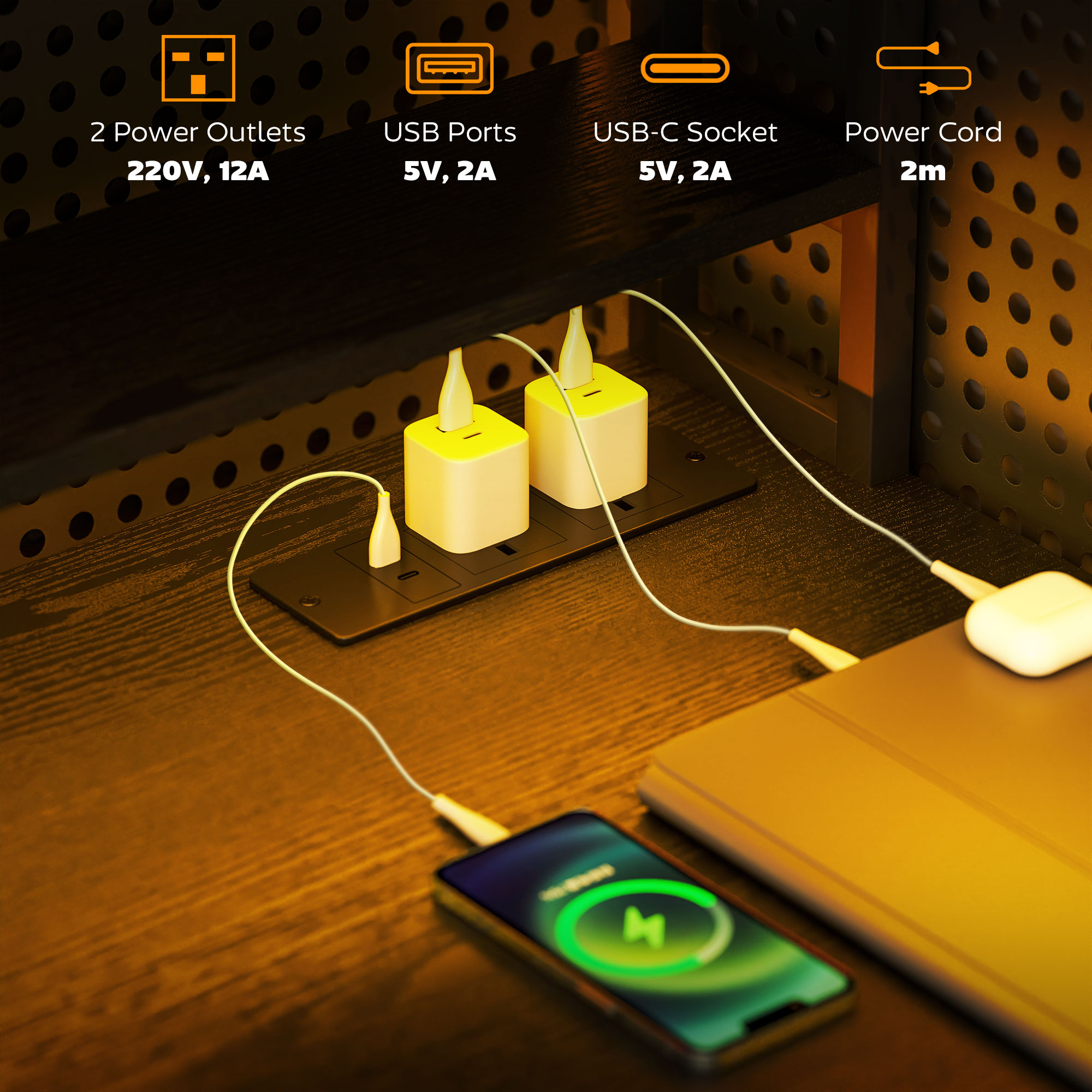 - Charging station includes two outlets and dual USB ports for convenience