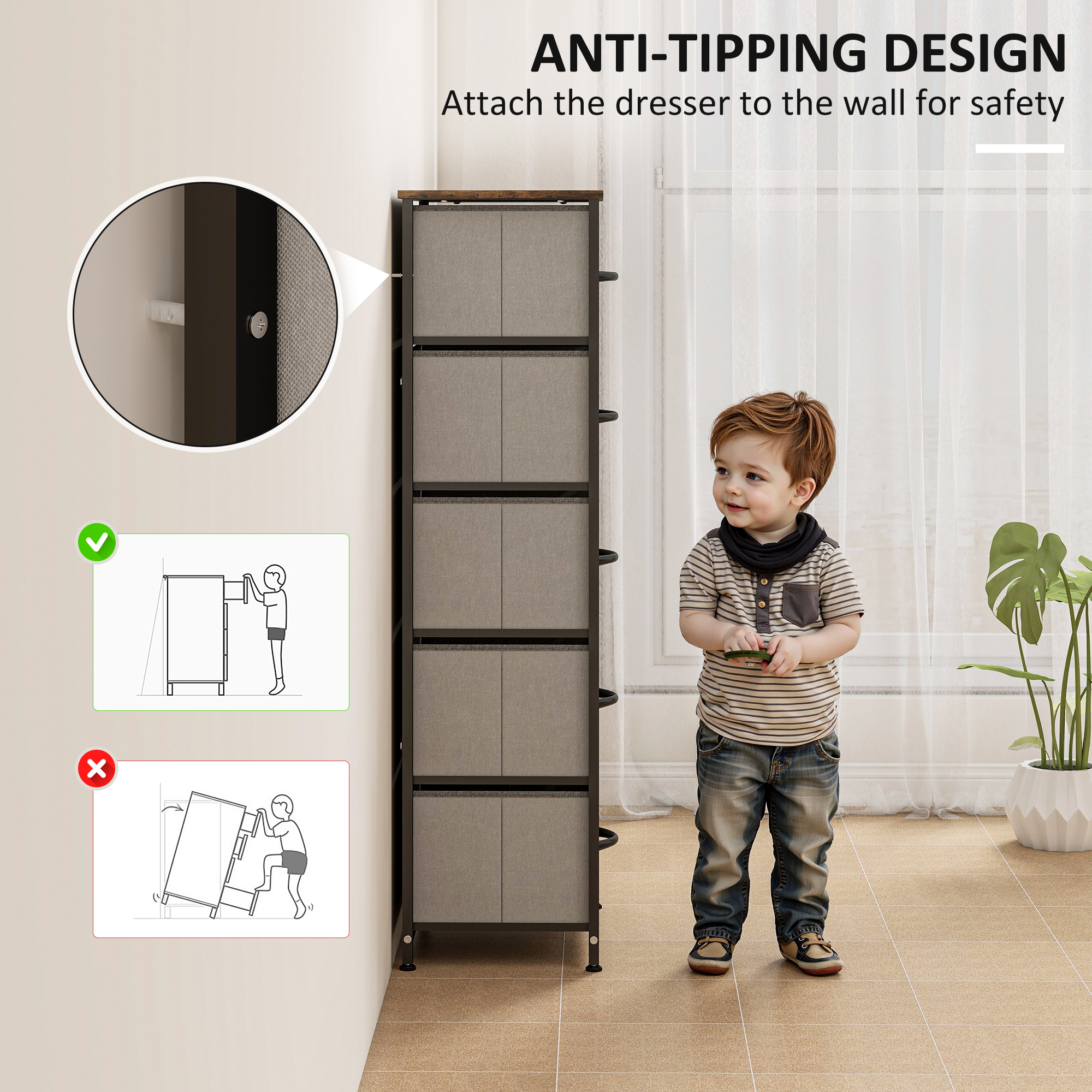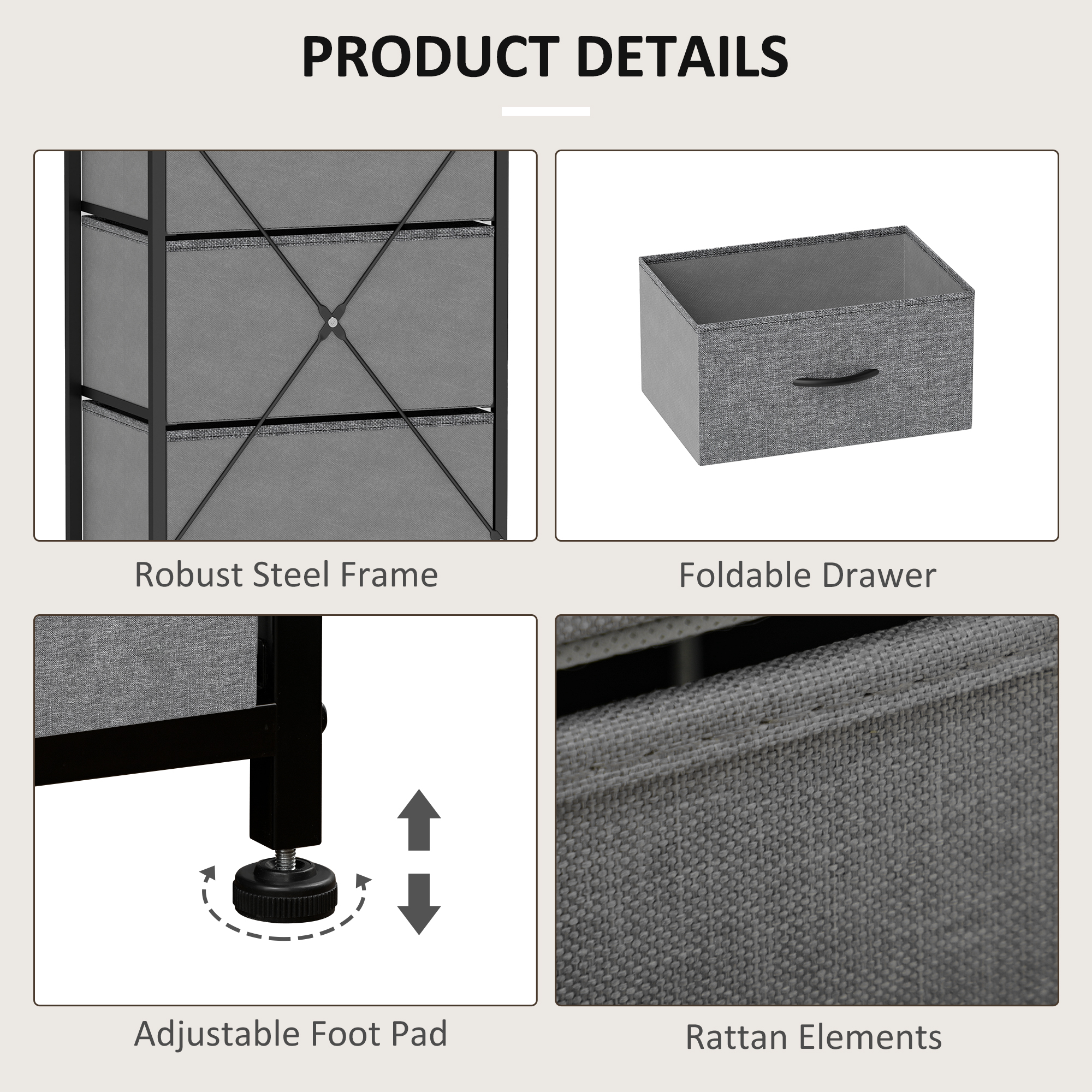 Home storage with this HOMCOM fabric chest of drawers. The five fabric drawers offer room for lots of things - keep t-shirts, tops, bottoms and more organised. The wood-effect top offers more room: a great place to display your favourite photos. The steel frame makes a strong core, with adjustable feet for balance. Comes with anti-tipping straps for safety. Use all over the home and office.
