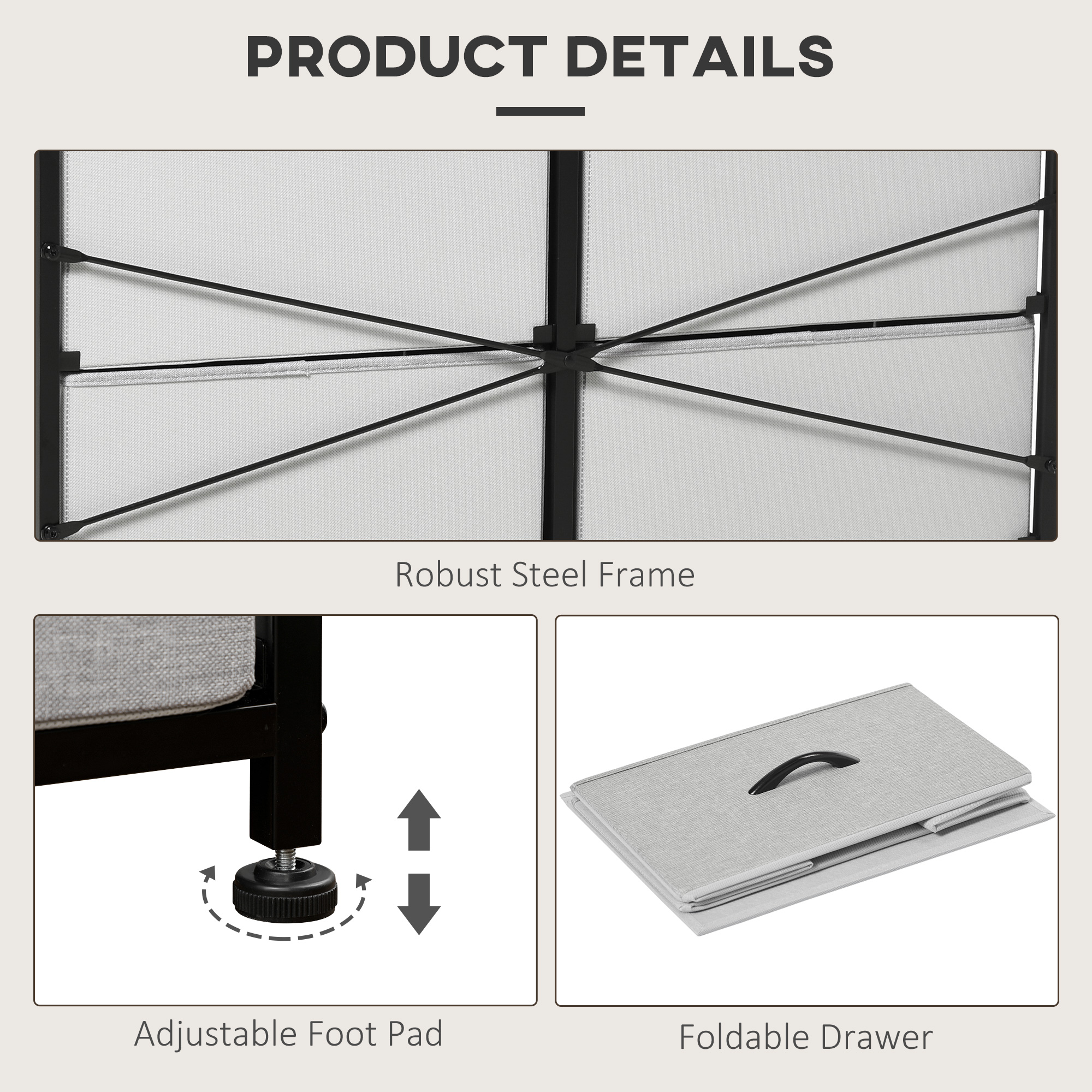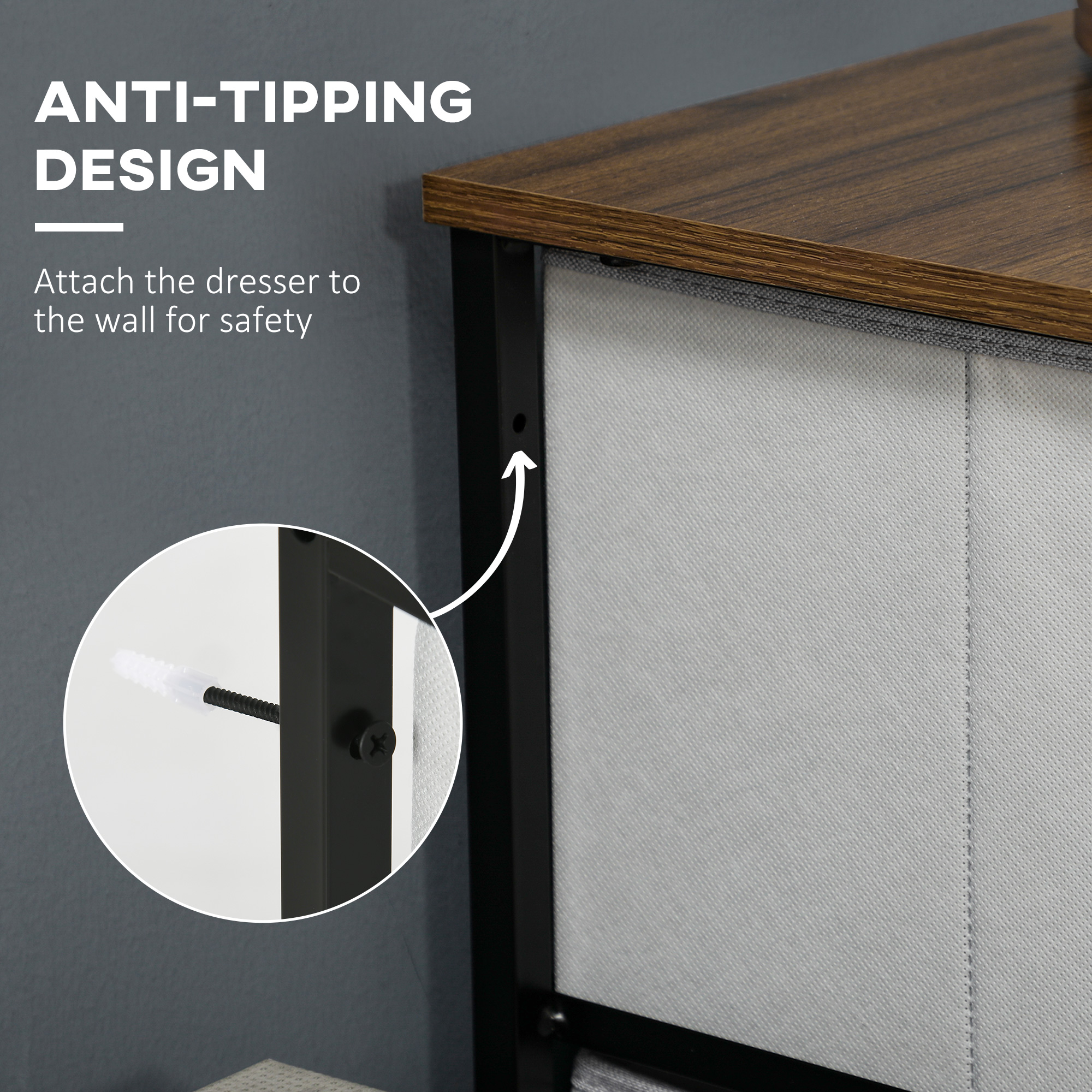 Home storage with this HOMCOM fabric chest of drawers. The eight fabric drawers offer room for lots of things - keep t-shirts, tops, bottoms and more organised. The wood-effect top offers more room: a great place to display your favourite photos. The steel frame makes a strong core, with adjustable feet for balance. Comes with anti-tipping straps for safety. Use all over the home and office.