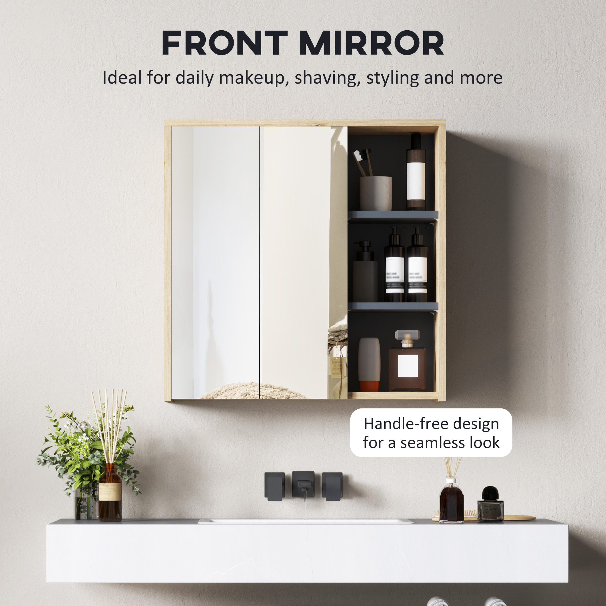 - Two mirrored doors, with a handle-free design: a clean, seamless look. Smooth-opening hinges