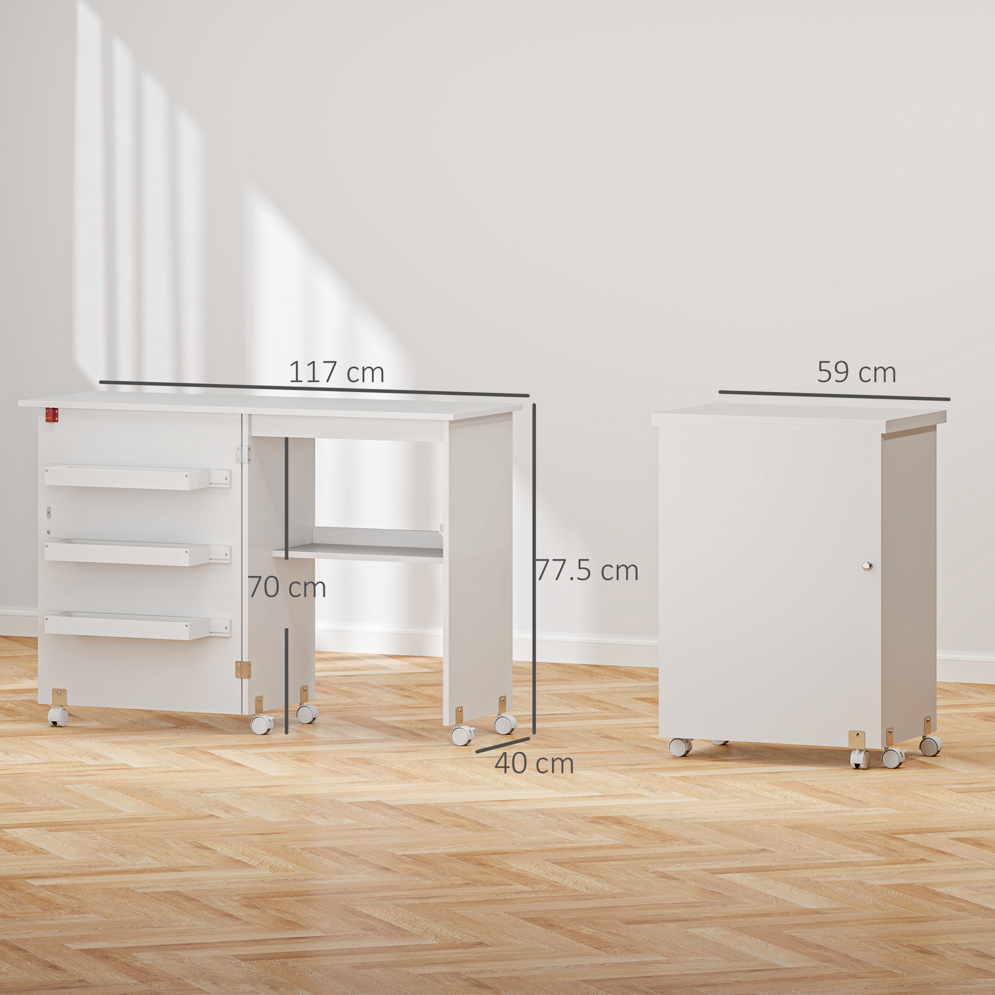 Transform your crafting with the folding sewing table from HOMCOM, a versatile sewing desk that expands with a drop leaf top and magnetic side for a spacious craft table. Tuck it away as a side cabinet when space is limited. Our sewing machine cabinet features lots of storage with three bins and an under-desk shelf, all set on five wheels for easy mobility. Suitable for any sewing enthusiast or as a dynamic crafting table.