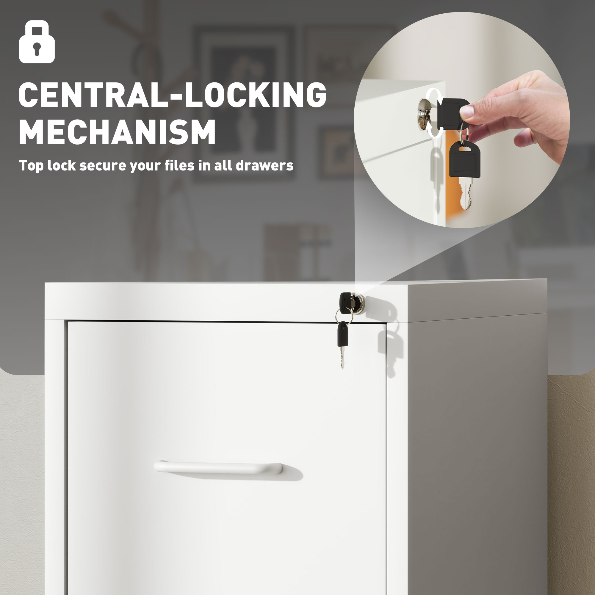 - Top central lock secures all drawers at once. Comes with two keys