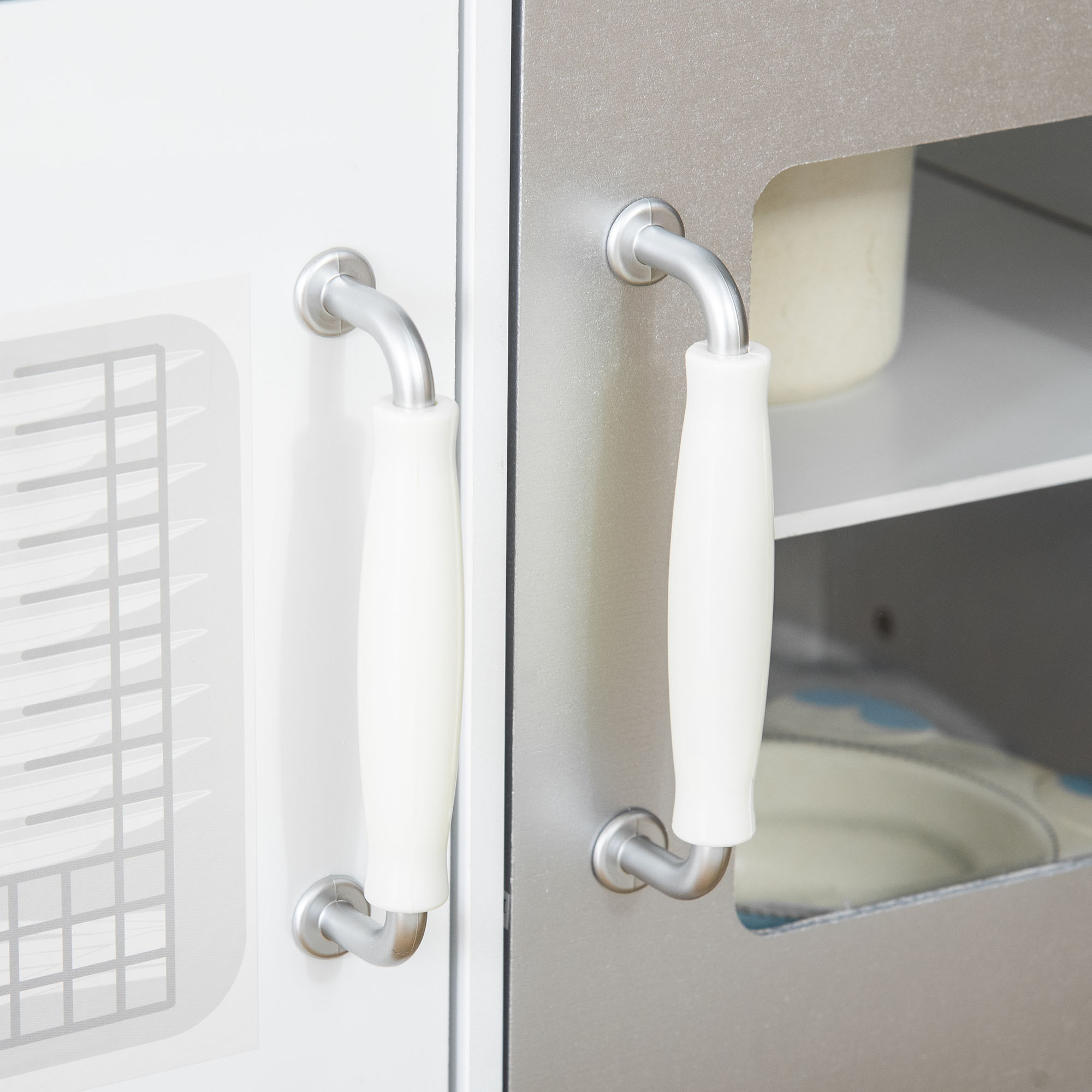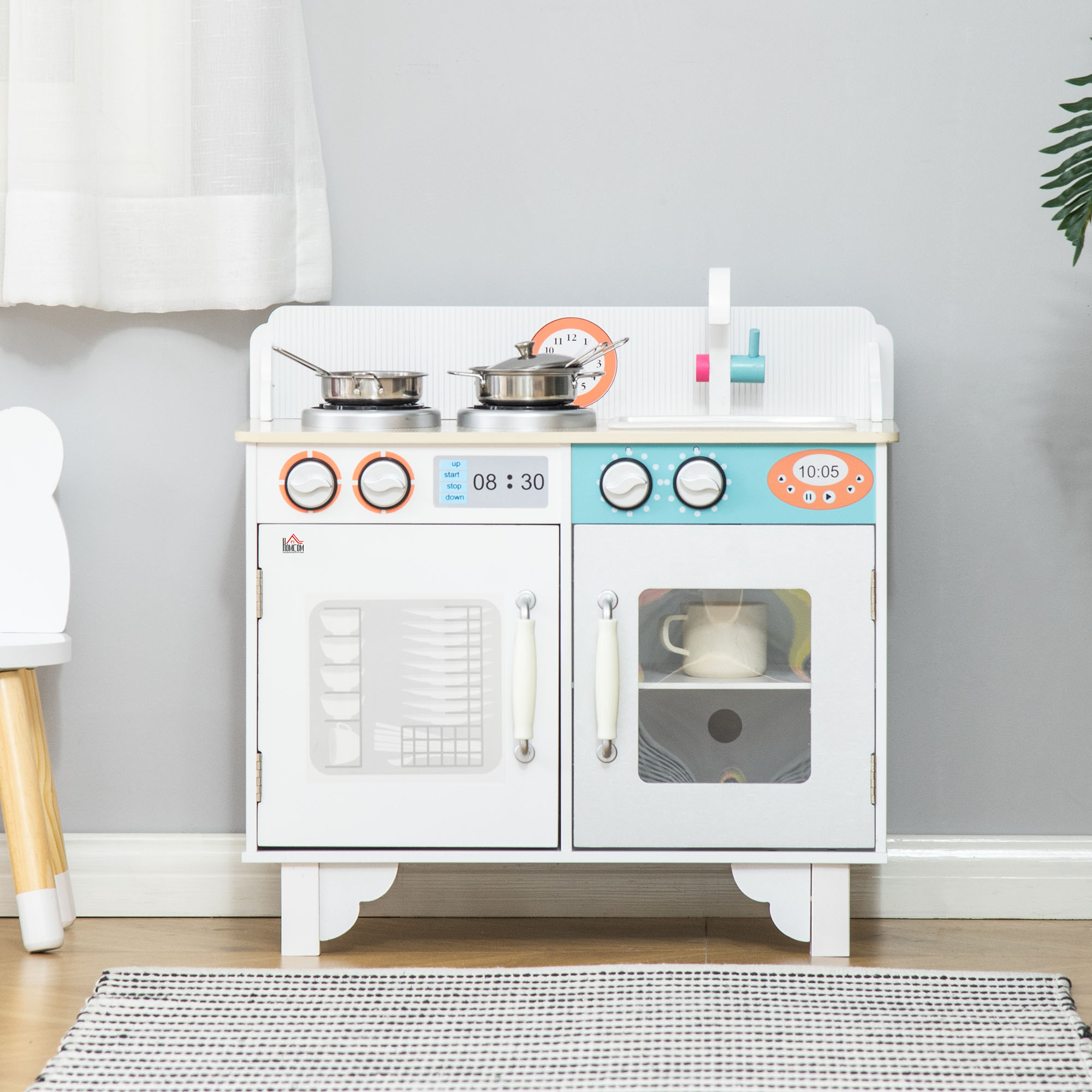 Playtime just got a lot better, thanks to this kids kitchen playset from HOMCOM. Their imagination can run wild as they use the sink, cooking bench, stainless pots and more. Turn the faucet and temperature dials to get their make-believe cooking underway. When playtime's over, store the accessories in the cabinets, keeping your room tidy. Don't worry about getting the set messy – made from MDF, it's easy to clean. The smooth rounded surfaces create a safe environment for your child to play.