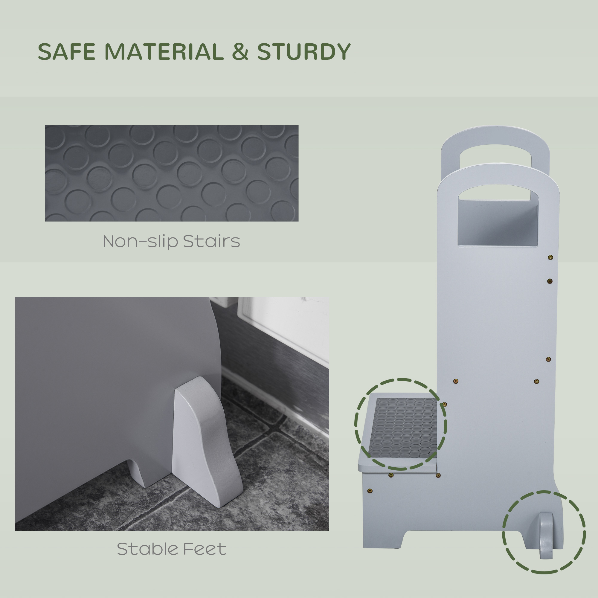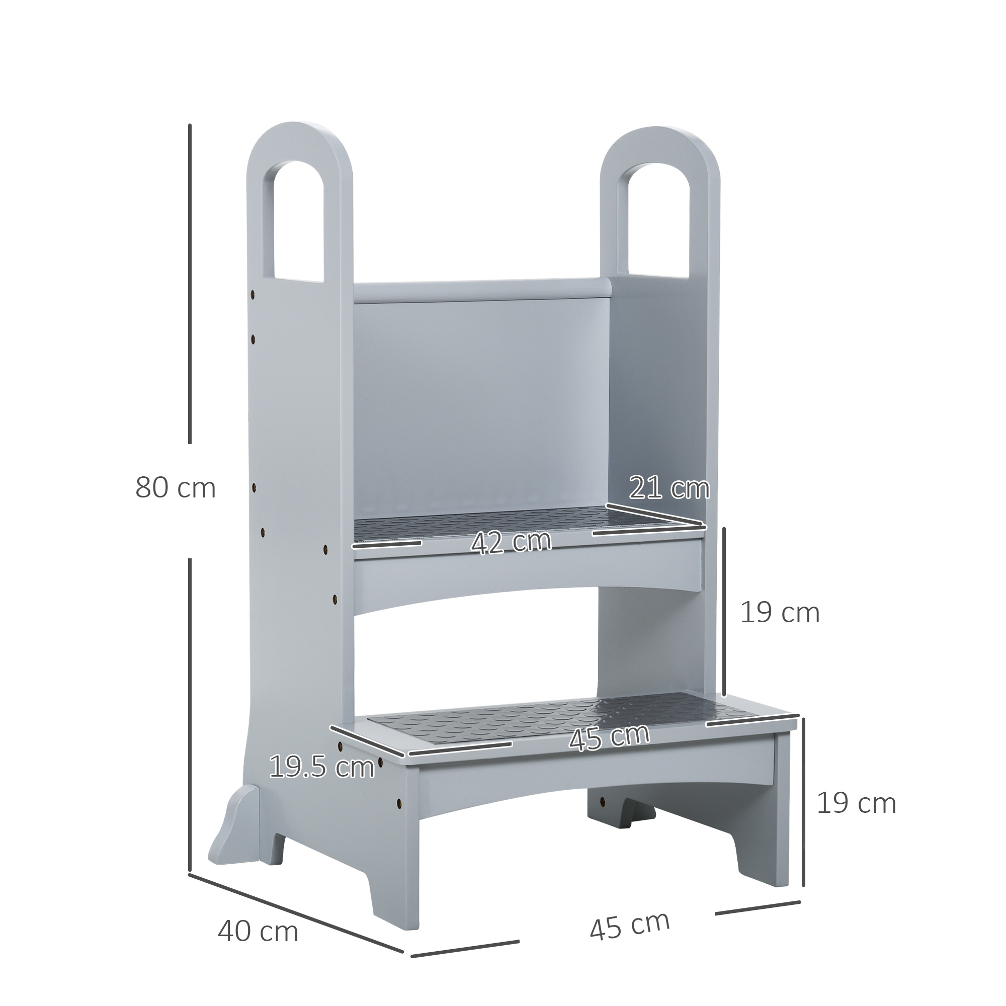 Elevate your child you new and exciting heights with this step from HOMCOM. It's suitable for use in the kitchen, bedroom and bathroom, helping them when brushing their teeth, washing hands and with other tasks around the house. The wooden structure is solid, reinforced with MDF for extra strength. It is fitted with handles so they can hold on whilst they move up and down the two steps. The non-slip panels on both steps ensure extra safety. A great way to build their confidence and help them develop their own sense of independence. Recommended for ages 3-8 years.