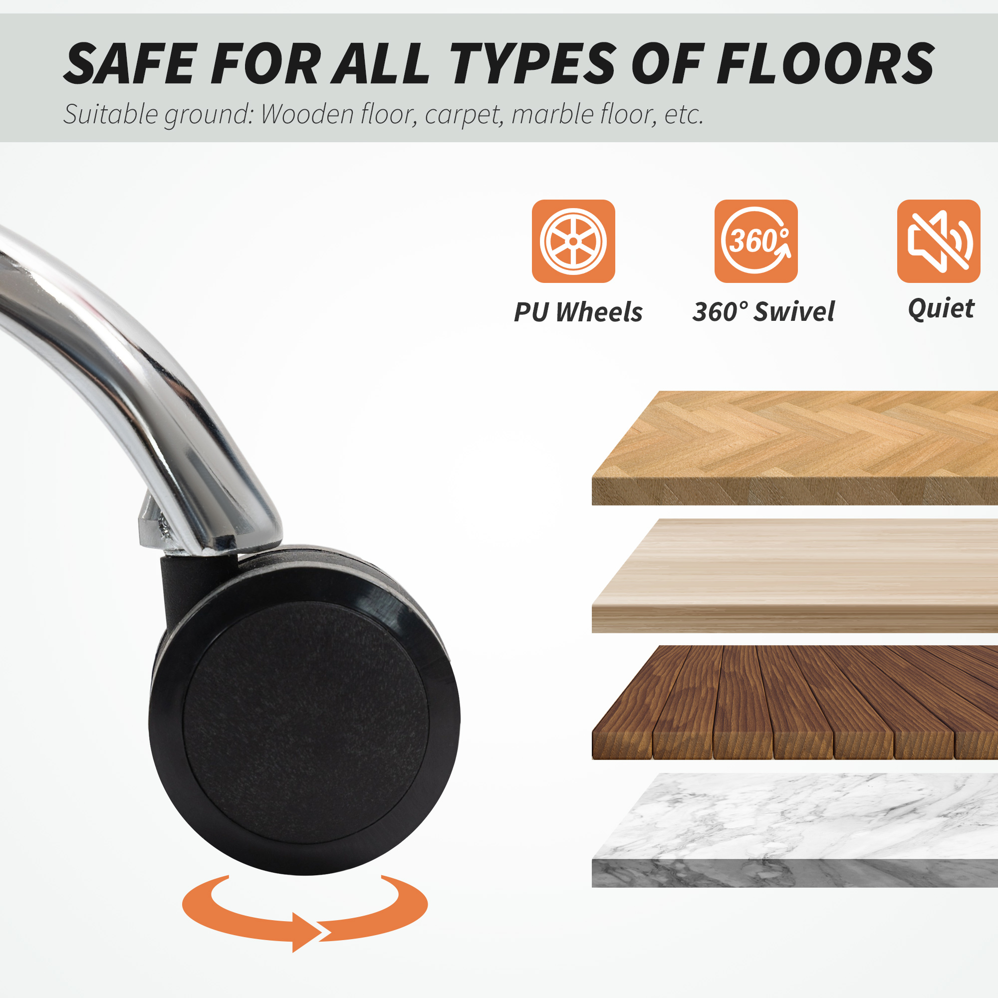 - Swivel seat and wheels for effortless mobility. Large PU wheels are floor-friendly, glide quietly and smoothly