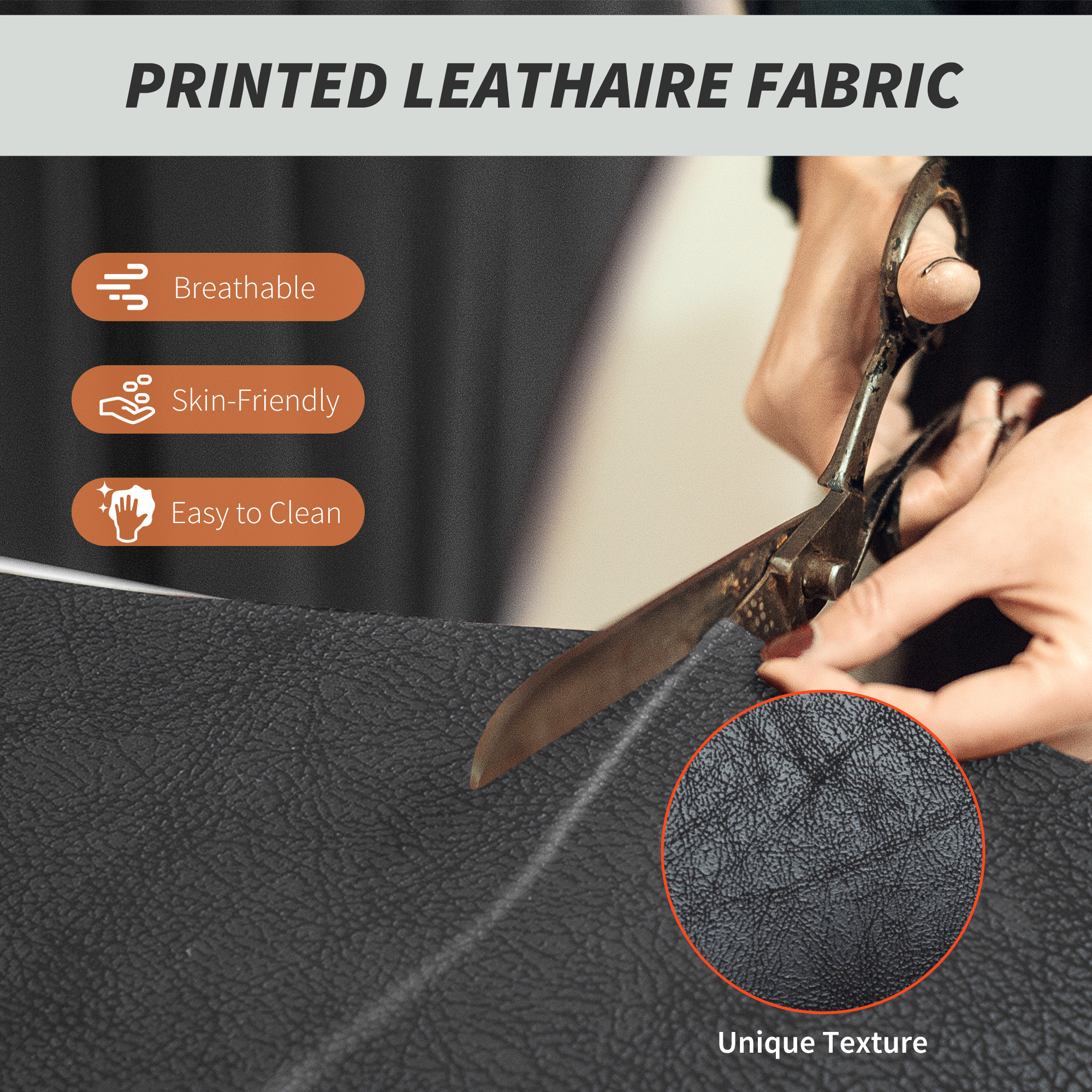 - Printed leathaire fabric combines breathability with a leather-like appearance