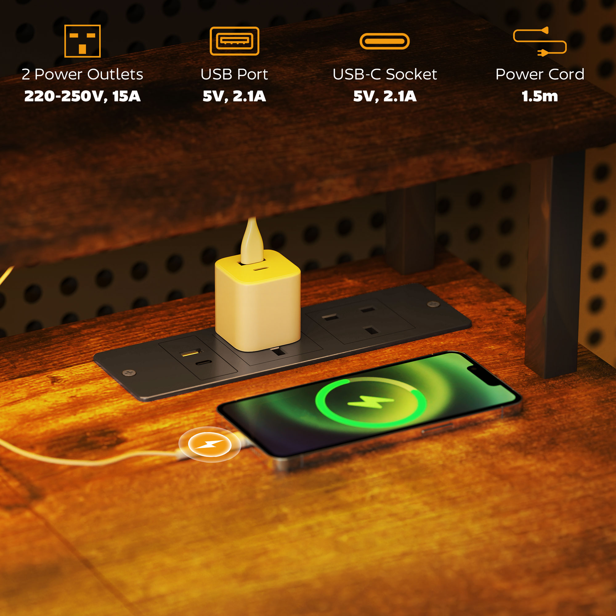 - Charging station with two UK plug sockets, a USB port and a USB-C socket