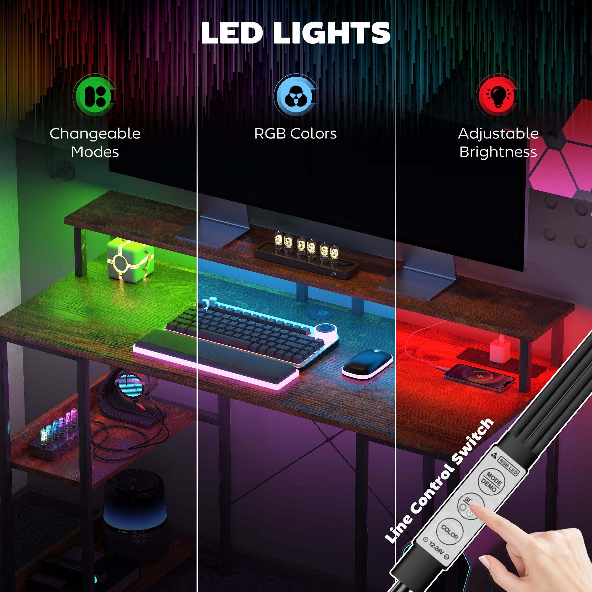 - RGB LED light has adjustable modes, brightness and colours