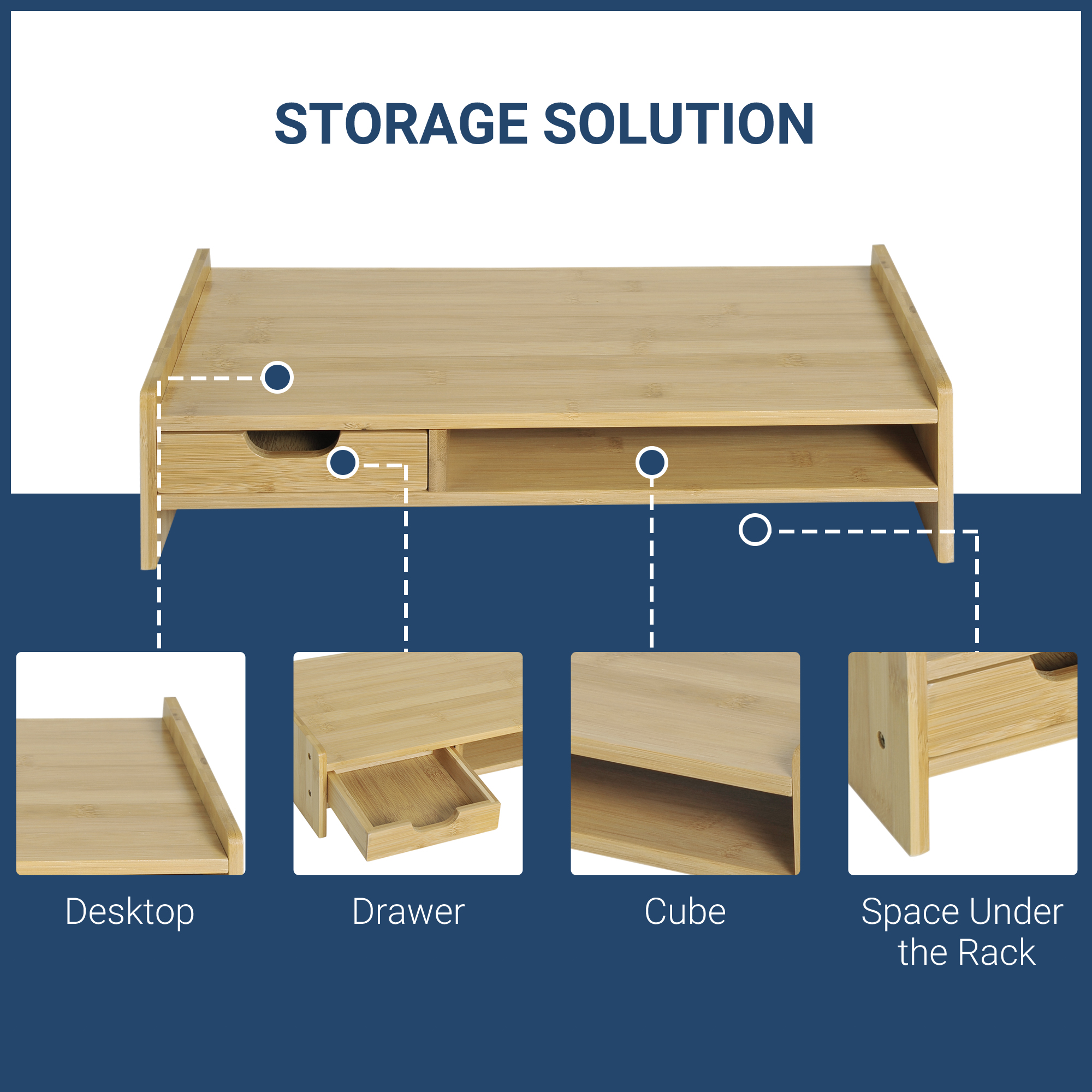 This desktop monitor stand from HOMOCM is a simple and economical addition to your office. Perfect to fit Mac mini, laptop, printer, raises monitor to a comfortable viewing height while maximizing work space, and reduces eye strain and neck and back pain. A drawer and a storage cube included to keep staplers, clips and other office supplies and a storage space under the rack for the keyboard and mouse. Get your healthier and efficient life starts with this perfect stand from HOMCOM!