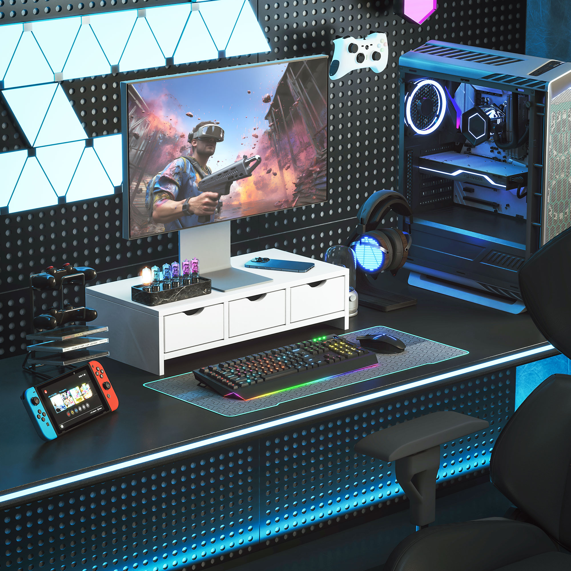 Elevate your screen to the optimal eye-level with the HOMCOM monitor riser stand, designed for super ergonomic comfort. Featuring three drawers with grooved handles to declutter your desk, this desk shelf fits a monitor up to 24". It's a stylish and practical choice for a seamless and comfortable computing experience.