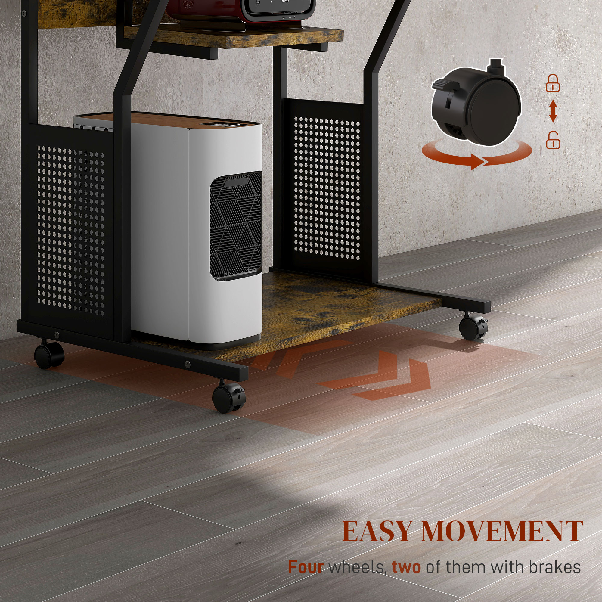 An all-in-one workspace with this HOMCOM compact computer desk. Design comes with a top shelf, tabletop and pull-out keyboard tray. Bottom shelf for CPU and other office essentials. Using a steel frame, this work desk is strong at the core, complete with four wheels to move around easily.