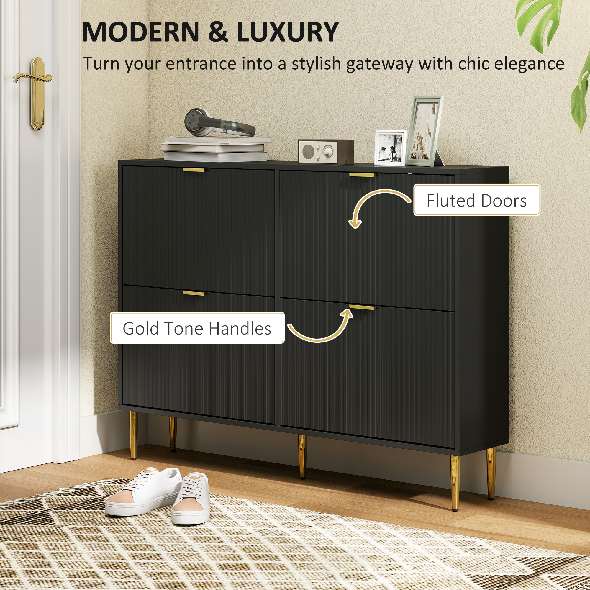 Transform your entryway with the HOMCOM shoe storage cabinet, featuring elegant fluted panel doors and gold tone handles that exude artistic charm. Designed to hold up to 20 pairs of shoes, it keeps your space organised and clutter-free. Adjustable shelves in this shoe rack cabinet accommodate sneakers, boots, or heels, ensuring your footwear stays protected. Elevate your home's style while enjoying a tidy, personalized storage solution.