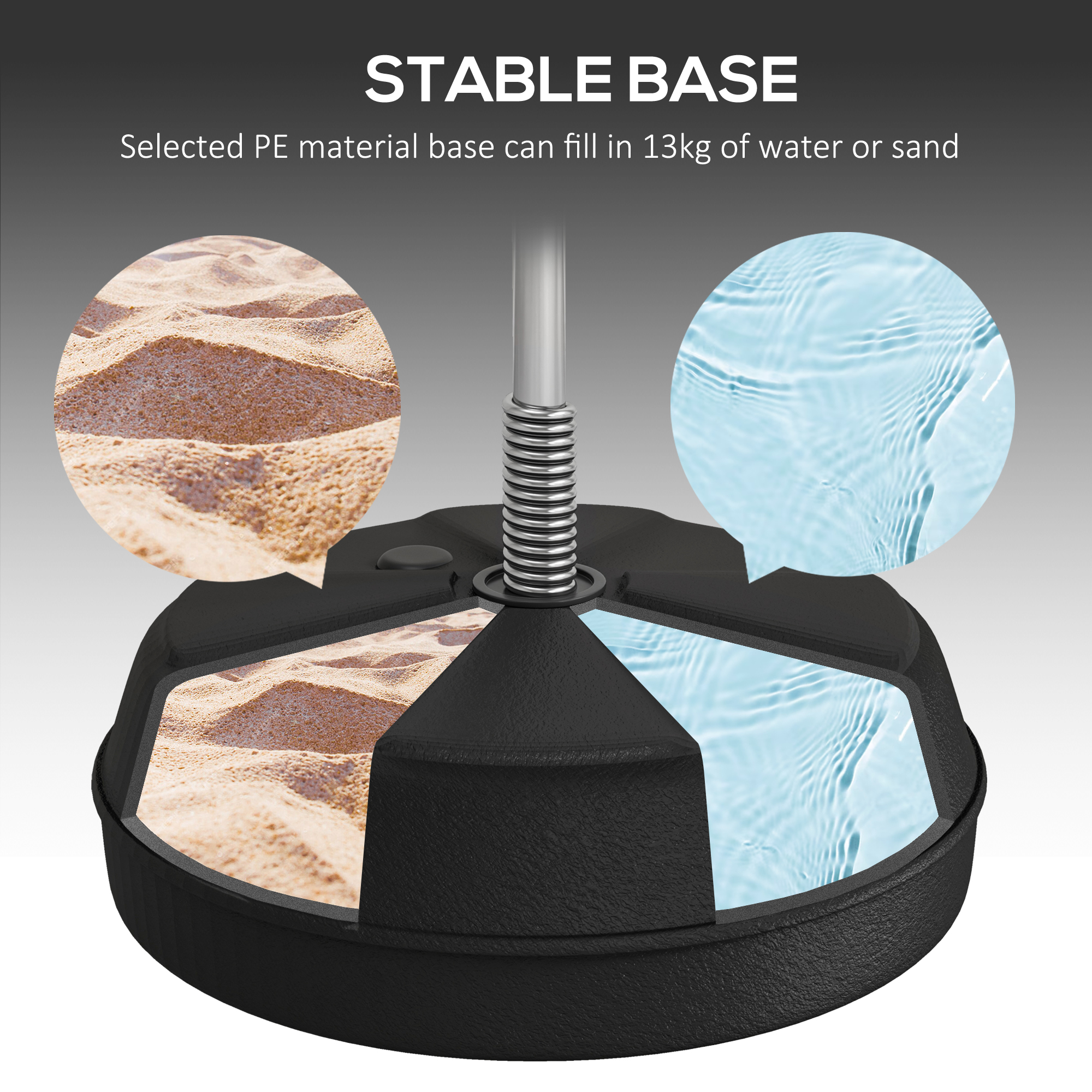 - Base load capacity: 13kg (water or sand)