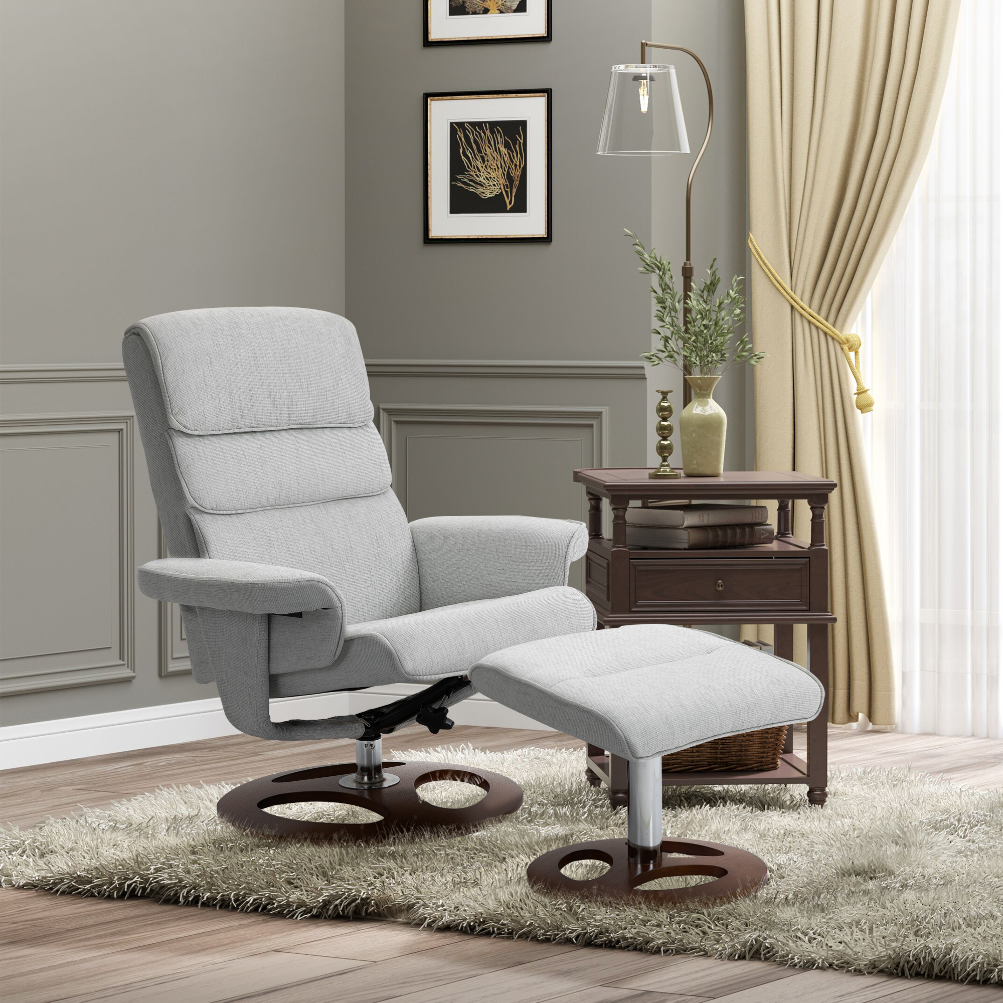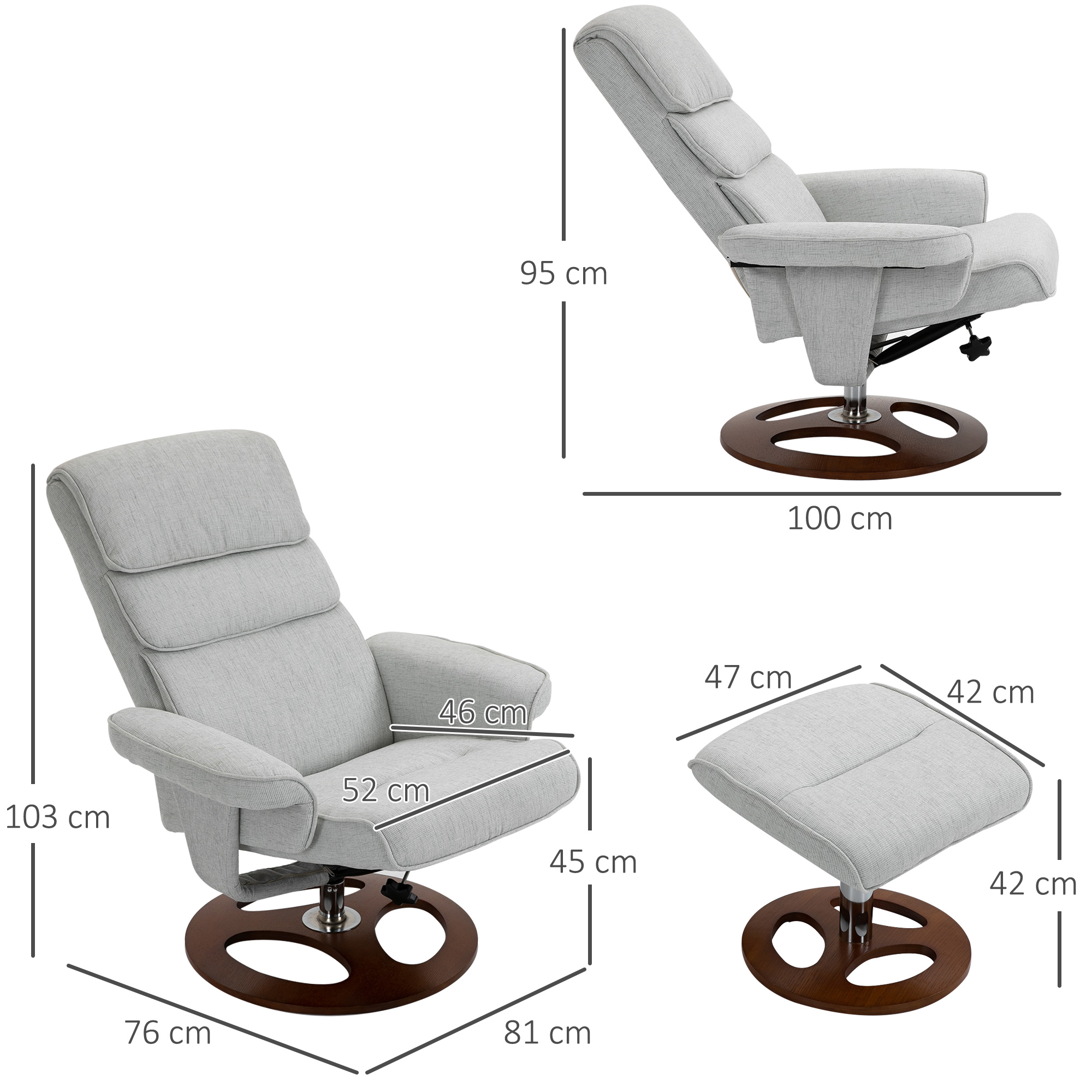 Take your relaxation time to the next level with this swivel recliner chair and footstool from HOMCOM. In a soft, versatile grey, the reclining armchair is built with a large solid wood base, supporting a weight up to 120kg for durability. 8cm padding means you'll be relaxing comfortably. The chair back reclines to a maximum 145° - so why don't you lay back, put your legs on the stool and relax?
