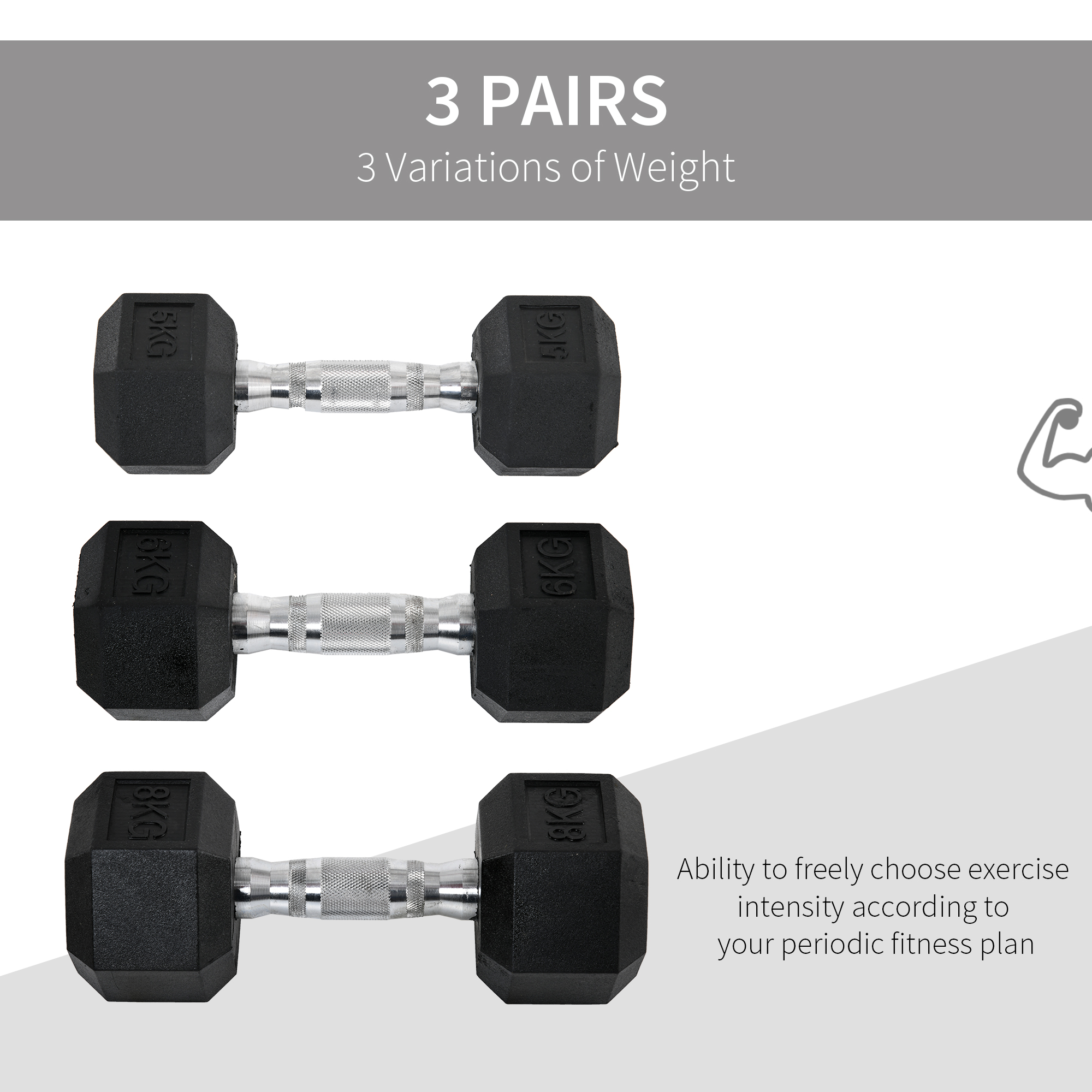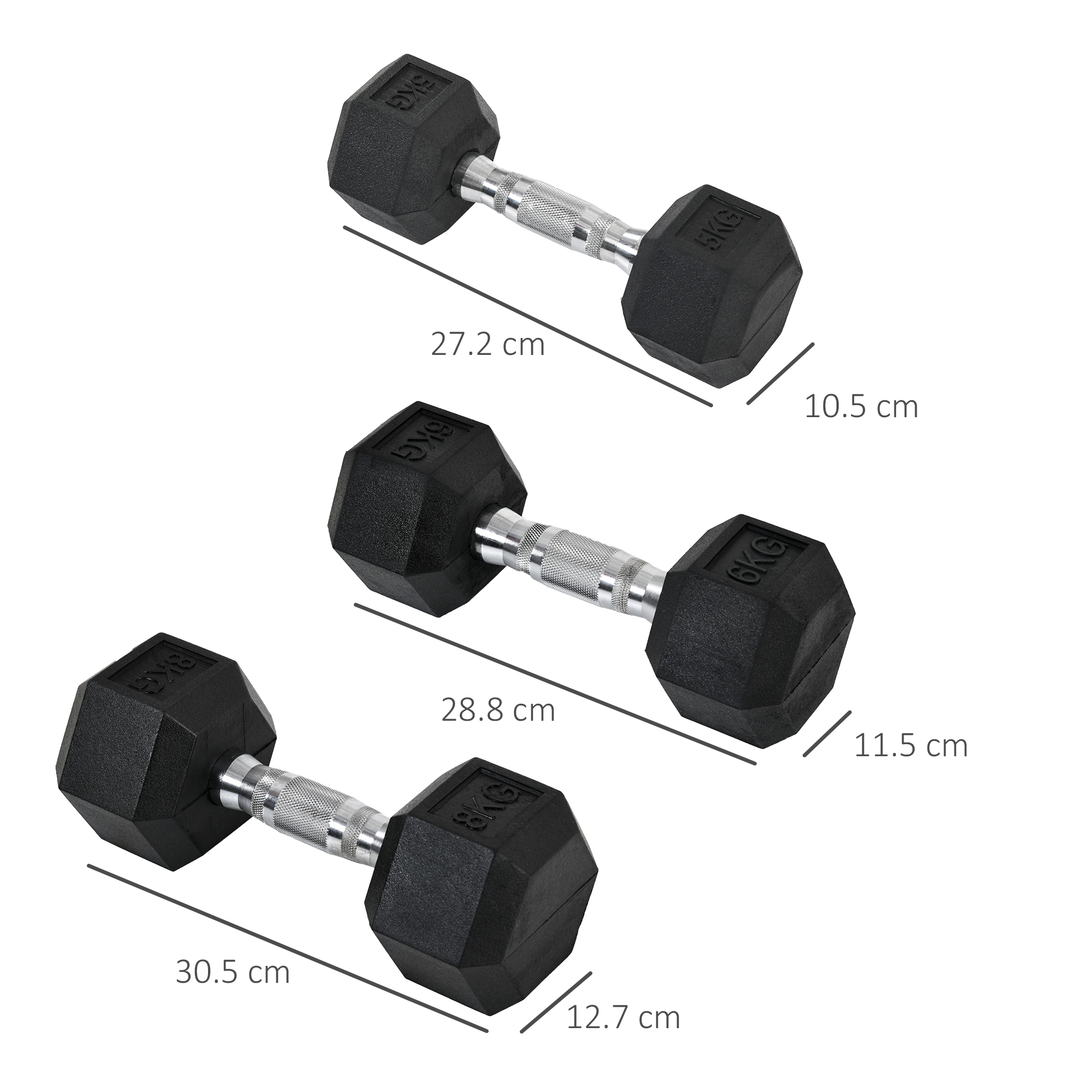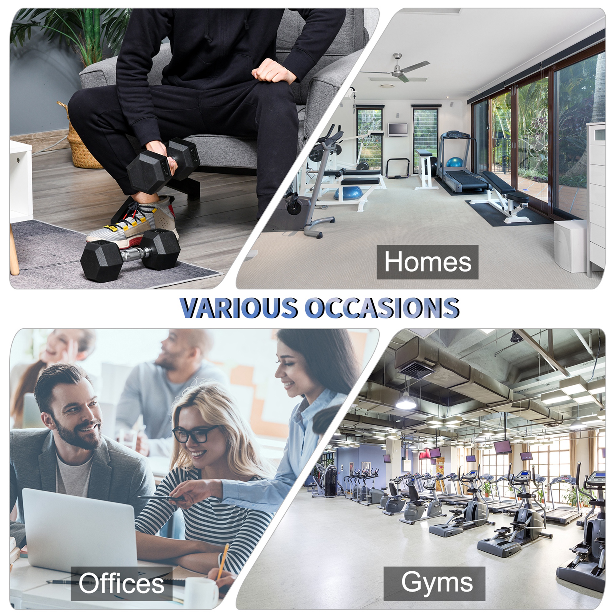 These 3 pairs of hexagon dumbbells with rubber heads are perfect for your phased fitness regime, suitable for home, gym and office exercise. Each weight is built with metal and rubber, making them durable and not easy to scratch the floor. The knurl guarantees your safety when you do alternating dumbbell curl, overhead shrug, dumbbell triceps kickback, etc. It's an ideal way to make exercise routine and to increase intensity of exercise gradually with the dumbbell sets.