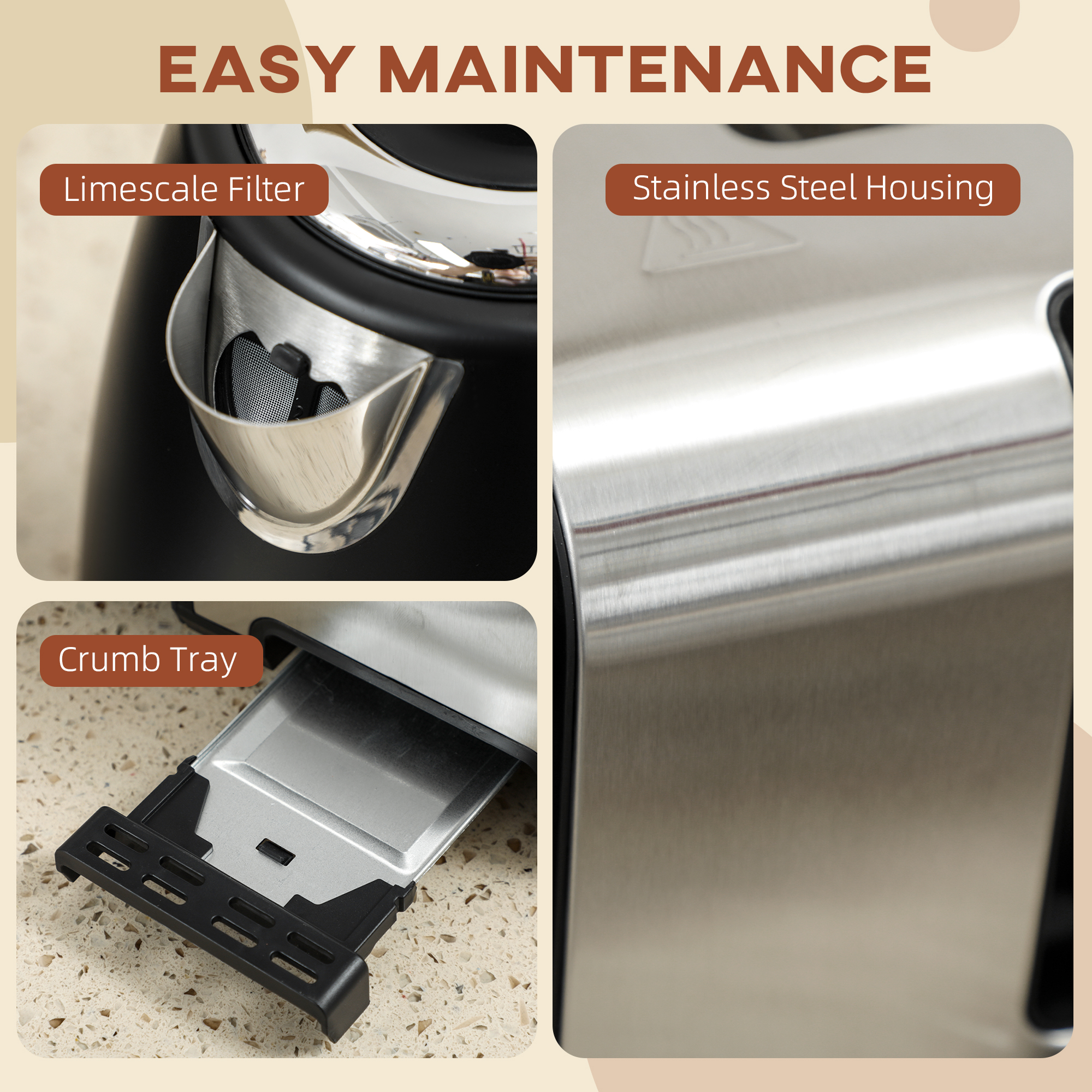 Start your mornings with the HOMCOM toaster and kettle set. Designed for busy families or home offices, the 1.7L kettle with UK Strix thermostat ensures rapid and accurate boiling with safety including auto shut-off, boil-dry and overheat protection, while the four-slot toaster offers independent controls and 7 shade settings for personalized perfection. From frozen bread to fresh slices, enjoy convenience. Elevate your breakfast routine with this stylish and unified kettle and toaster set.