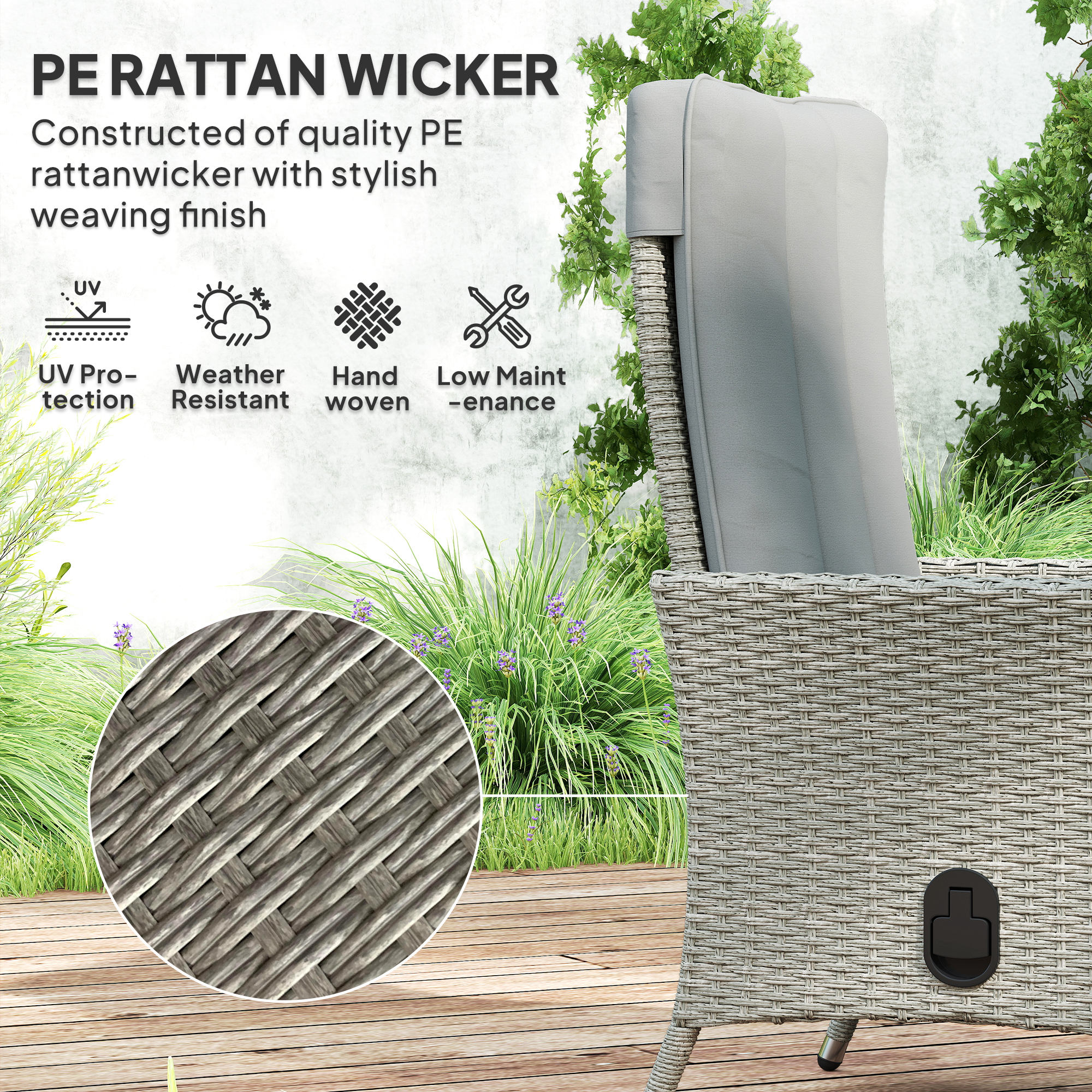 Comfort your way with this Outsunny rattan recliner chair. Adjust the back easily between 105°-150°: lie back to the position you want. It comes with a thick padded seat cushion for comfort, with washable covers to ensure they keep clean. Using powder coated steel for a strong core, wrapped in stylish and protective plastic rattan to finish.