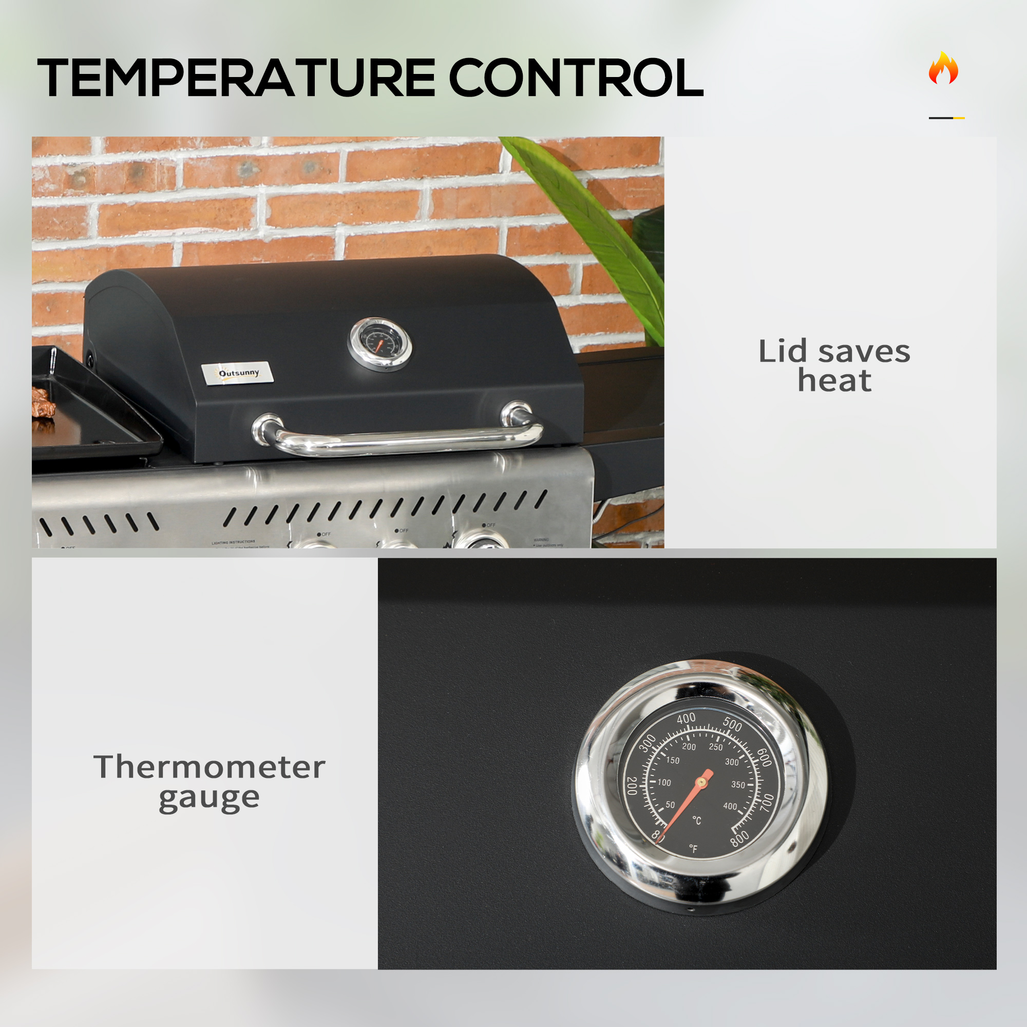 Sizzle and sear like a pro with this Outsunny deluxe BBQ. The two-in-one design combines a gas bbq and plancha grill. The 3825cm² cooking surface is large enough to cook 8-16 servings. Gas grill features a lid: control the smokiness, with the thermometer to see inside temperature easily. Use the side burner to add extra sizzle. Complete with two wheels to move around easily.
