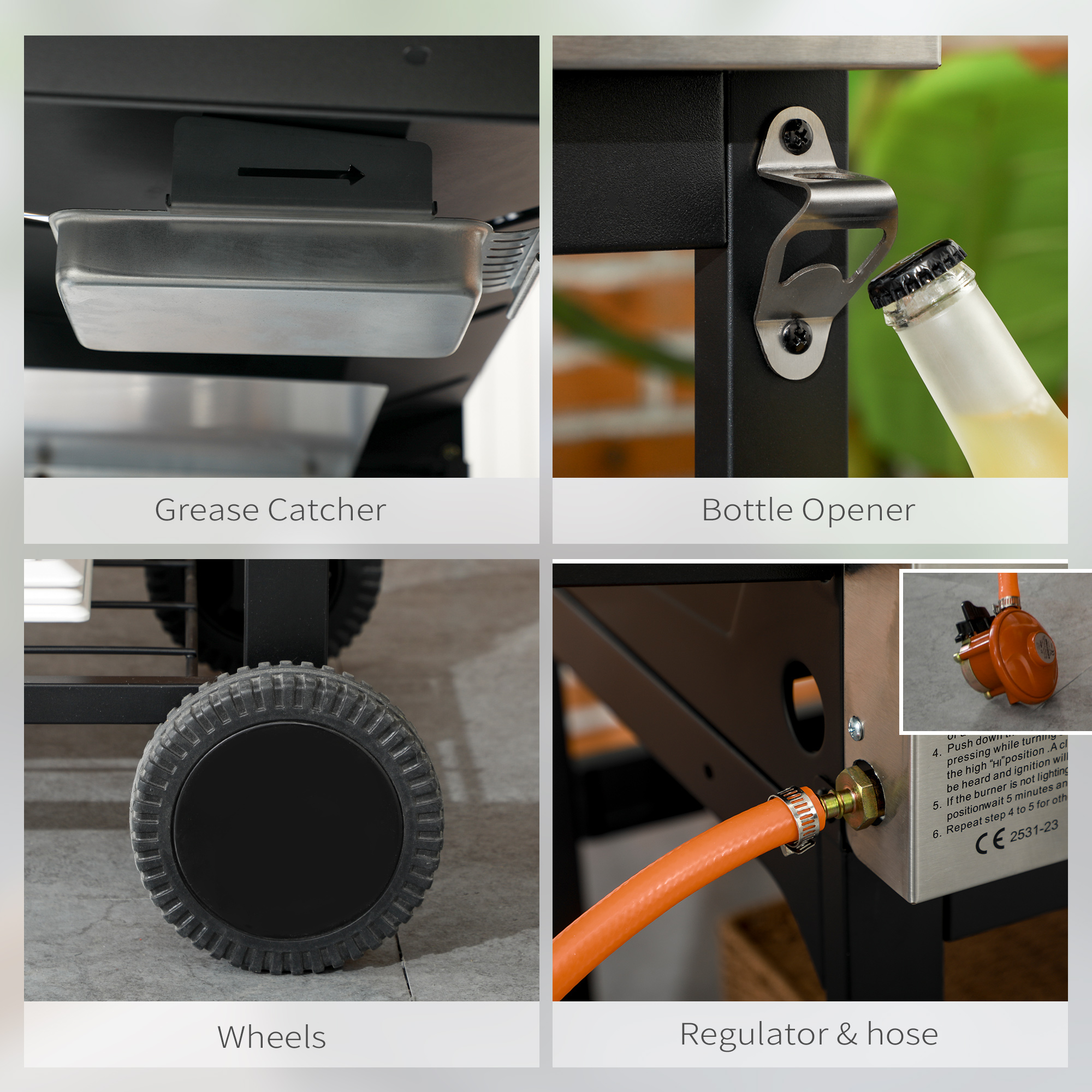 - Weight Capacity: (grill grate) 10 kg, (bottom shelf) 20 kg, (side shelf) 5 kg