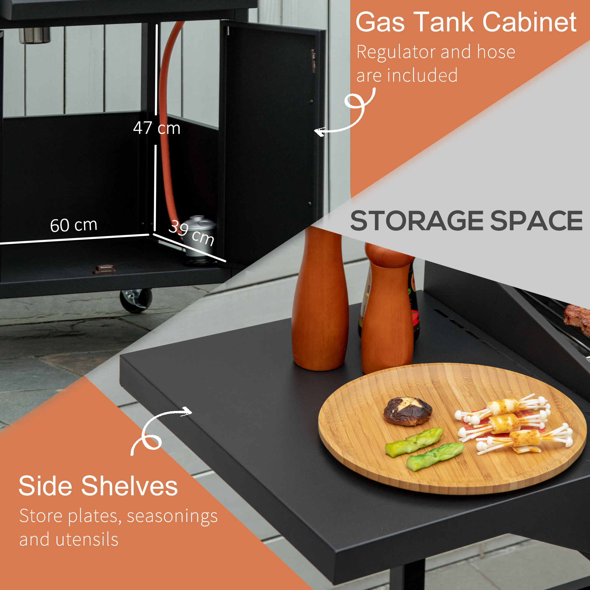 The delicious taste of summer is impeccably close with this Outsunny gas BBQ. There are four burners to create individual cooking zones - easy to cook a variety of food; paired with the large grill, it's suitable for hosting big BBQs. Each burner can be turned on easily with the piezo ignition. Unit features two side shelves, top warming rack and bottom cabinet - plenty of room. Pull the lid down when cooking for a smoked effect - finished with a thermometer to see the inner temperature.
