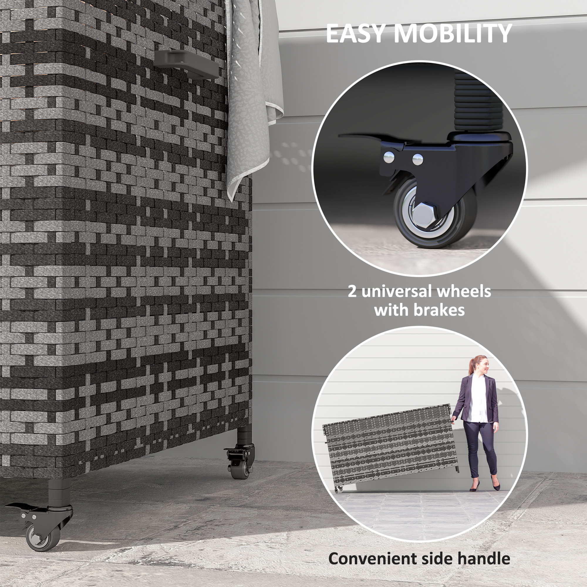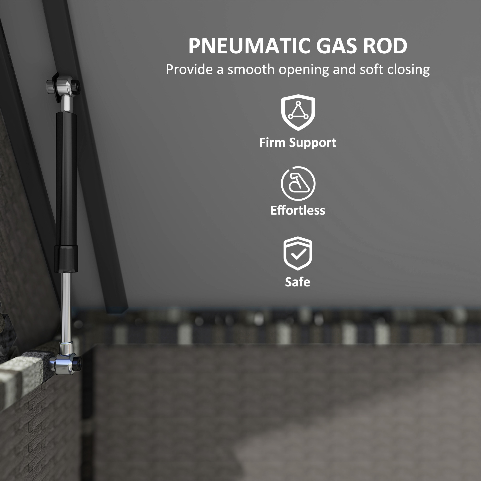 This Outsunny 627 L garden storage box is a safe, protective place for garden tools, supplies and other accessories. Fitted with a gas strut lift mechanism to ensure the lid opens and closes safely and steadily. A powder coated steel frame means a strong core, wrapped in stylish and tough plastic rattan. Complete with a handle and two wheels to move around, even when heavy.