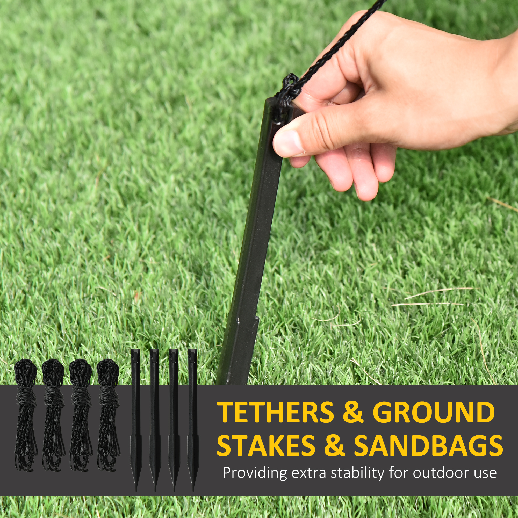 - Four ground stakes, four guy ropes and three sandbags to pin and stabilise to ground