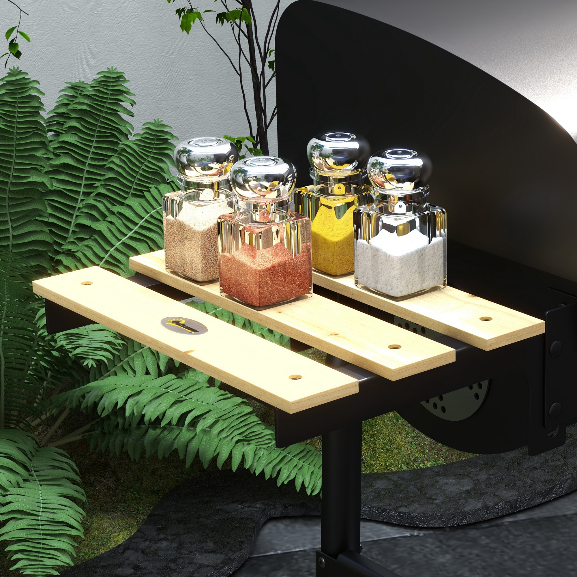 - Weight Capacity: (overall) 15kg, (grill grate) 5kg, (side shelf) 2.5kg, (bottom shelf) 5kg