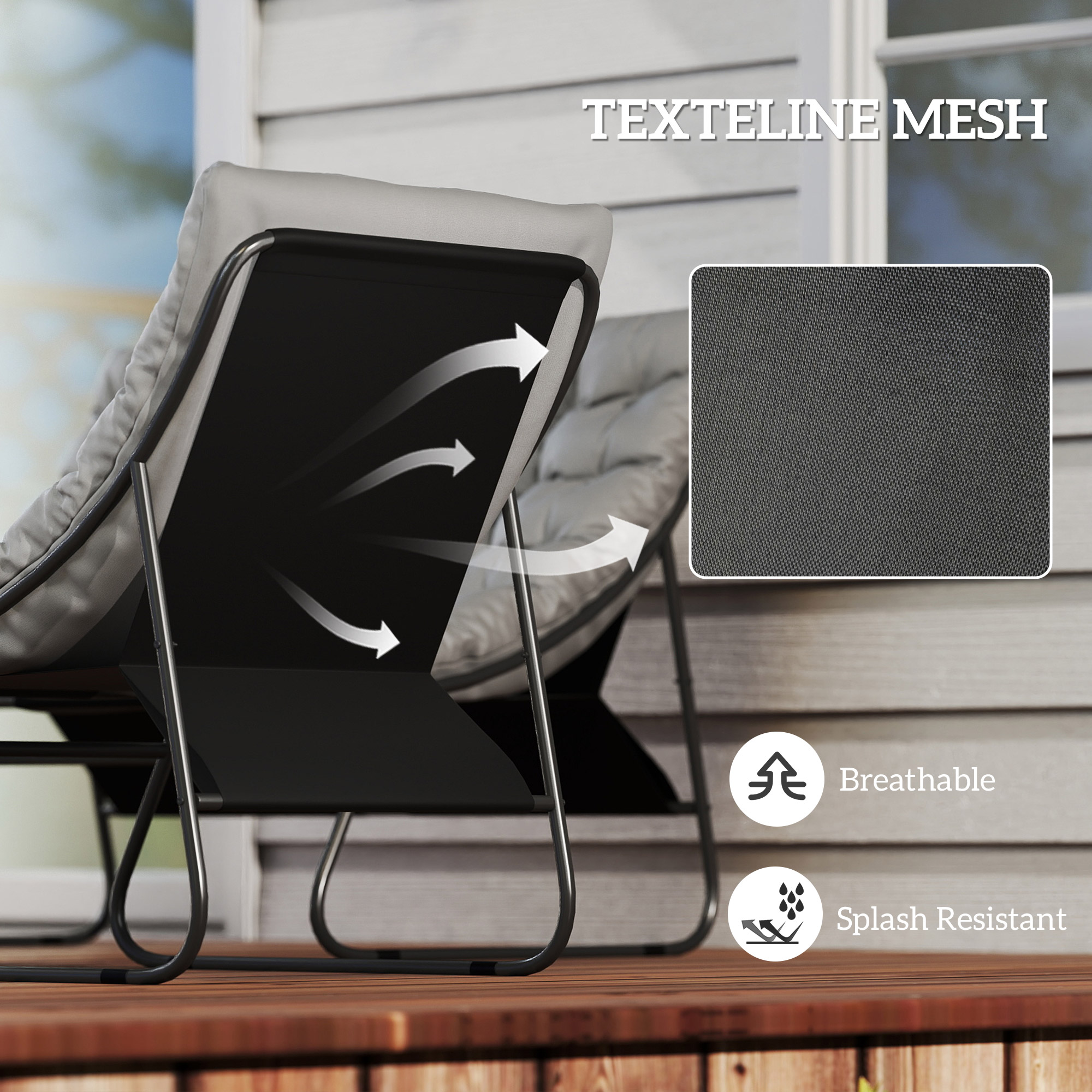 - Materials: Steel, Texteline Mesh, Foam, PE Rattan, PP Cotton, Tempered Glass