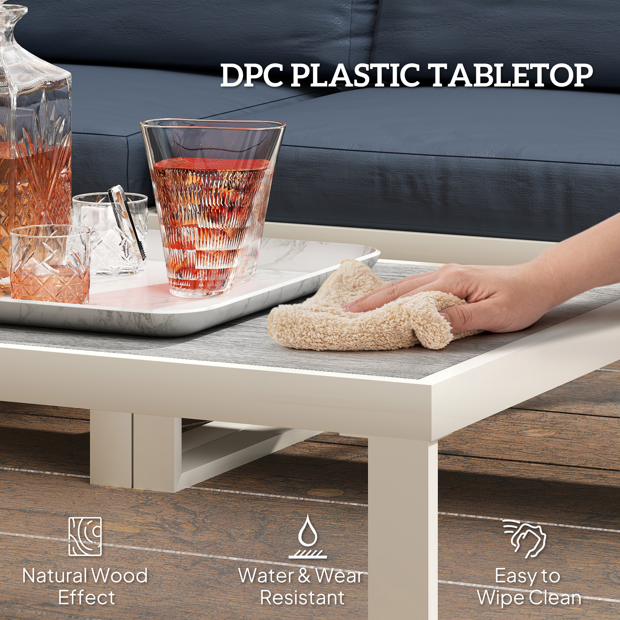 - DPC plastic tabletop is wear and water-resistant for easy cleaning, with wood grain look for beauty